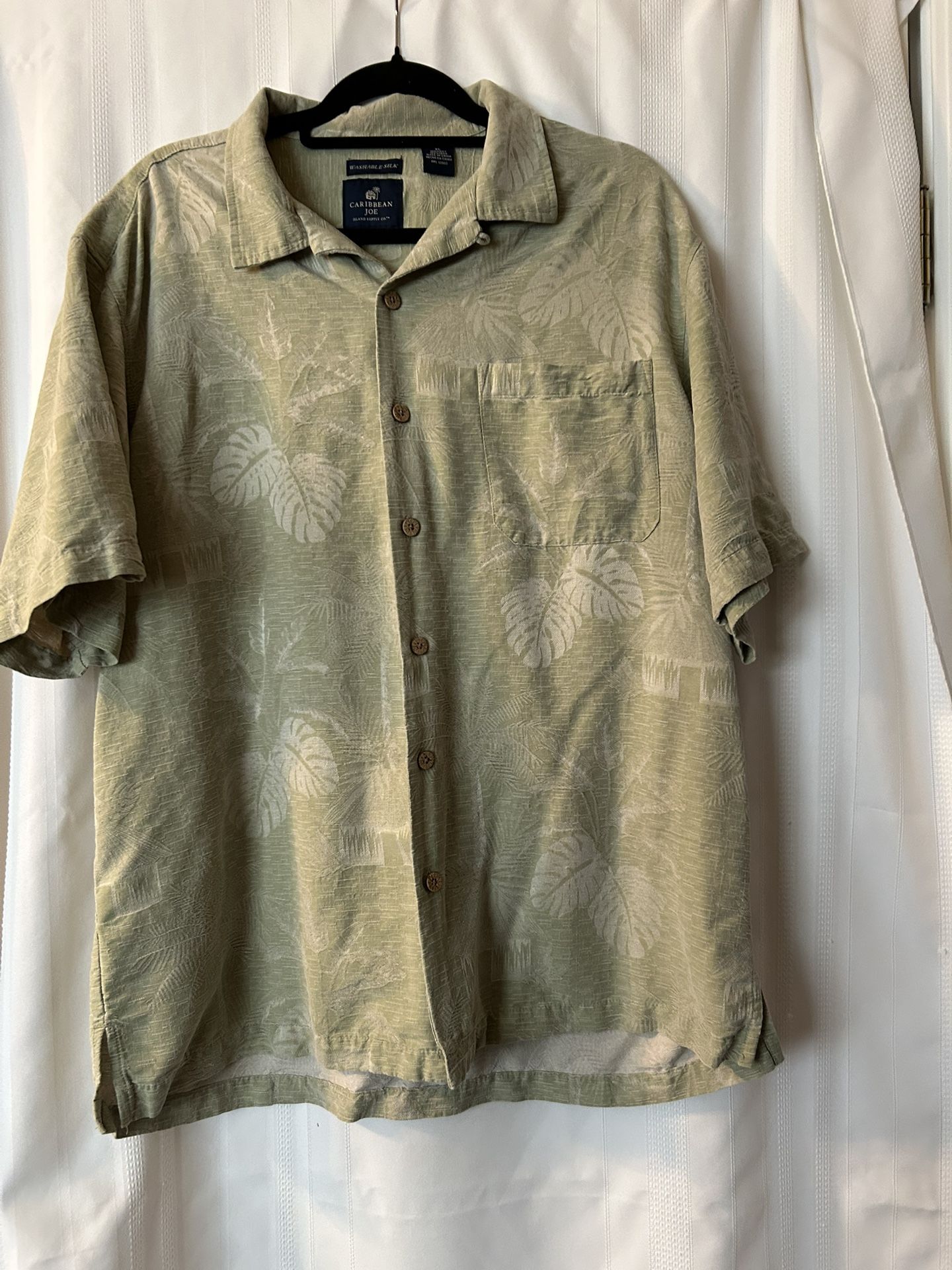 The Caribbean Joe Hawaiian Shirt is a stylish and vibrant option for men looking to add a touch of tropical flair to their wardrobe. Made from 100% silk, this short sleeve shirt features a floral pattern and a spread collar, perfect for a casual or travel setting. The green color and Hawaiian theme make it a great choice for the summer, fall, and spring seasons. With a regular fit and XL size, this shirt is comfortable and eye-catching, ideal for men who appreciate a unique and colorful style. Chest Measurements 25”front length 28” 29” Back length .