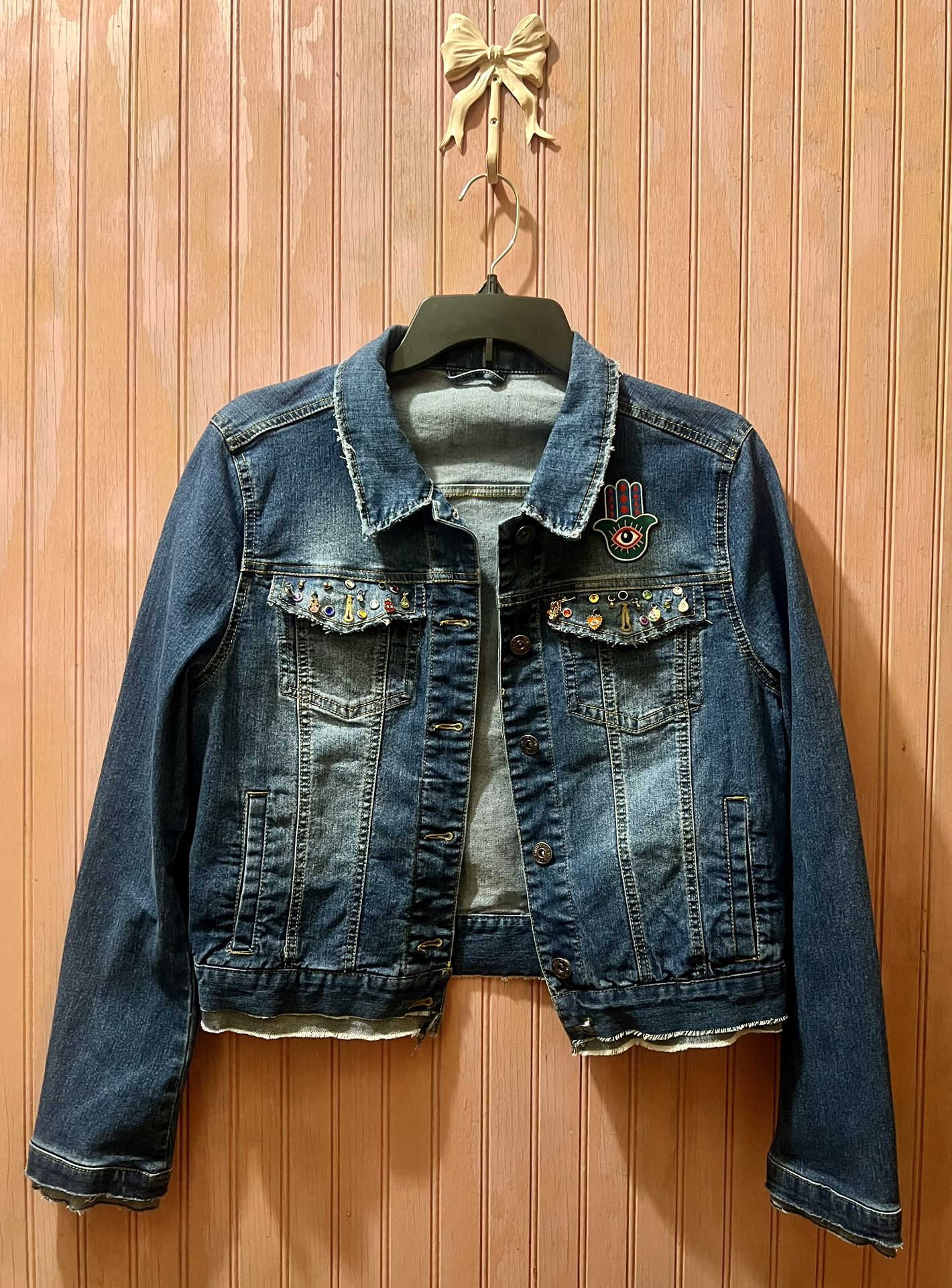 Upcycled Charming Hamsa Denim Jacket. Ladies Size Medium. $25 Cash.
