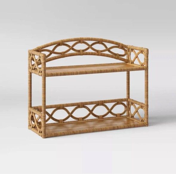 Threshold Rattan Wall Hanging Shelf Lacquered Finish No Assembly 2-Tier Tan Dimensions (Overall): 17 Inches (H) x 22.2 Inches (W) x 8 Inches (D)