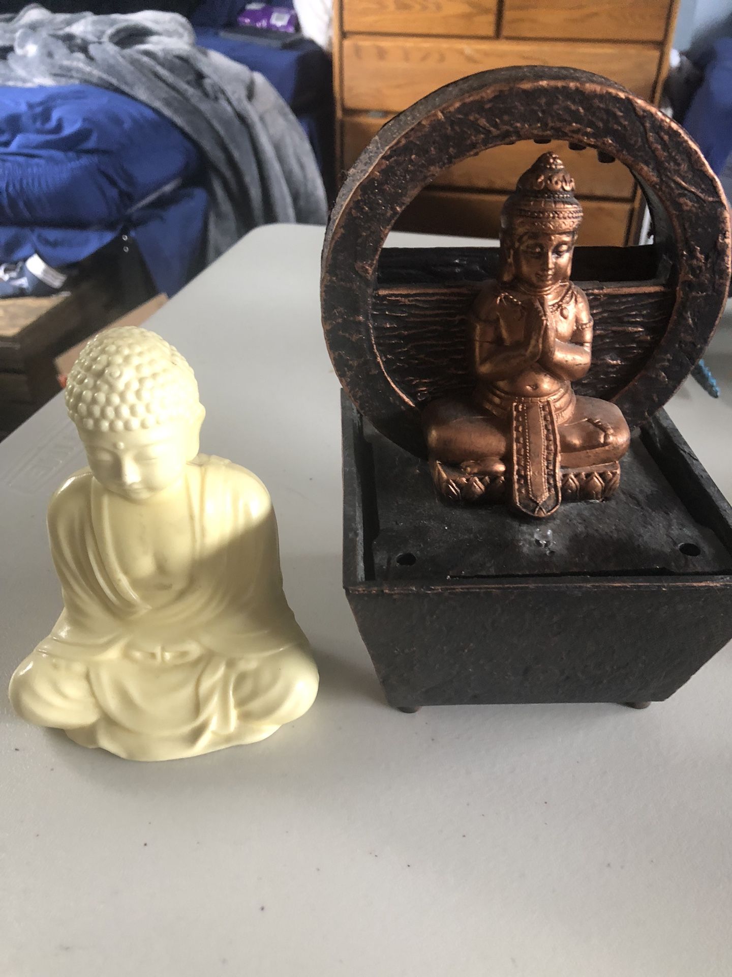 2 small Buddhas the bigger one is some sort of water fall thing and takes batteries I think, Asking 15$ obo, cash only, porch pick up only