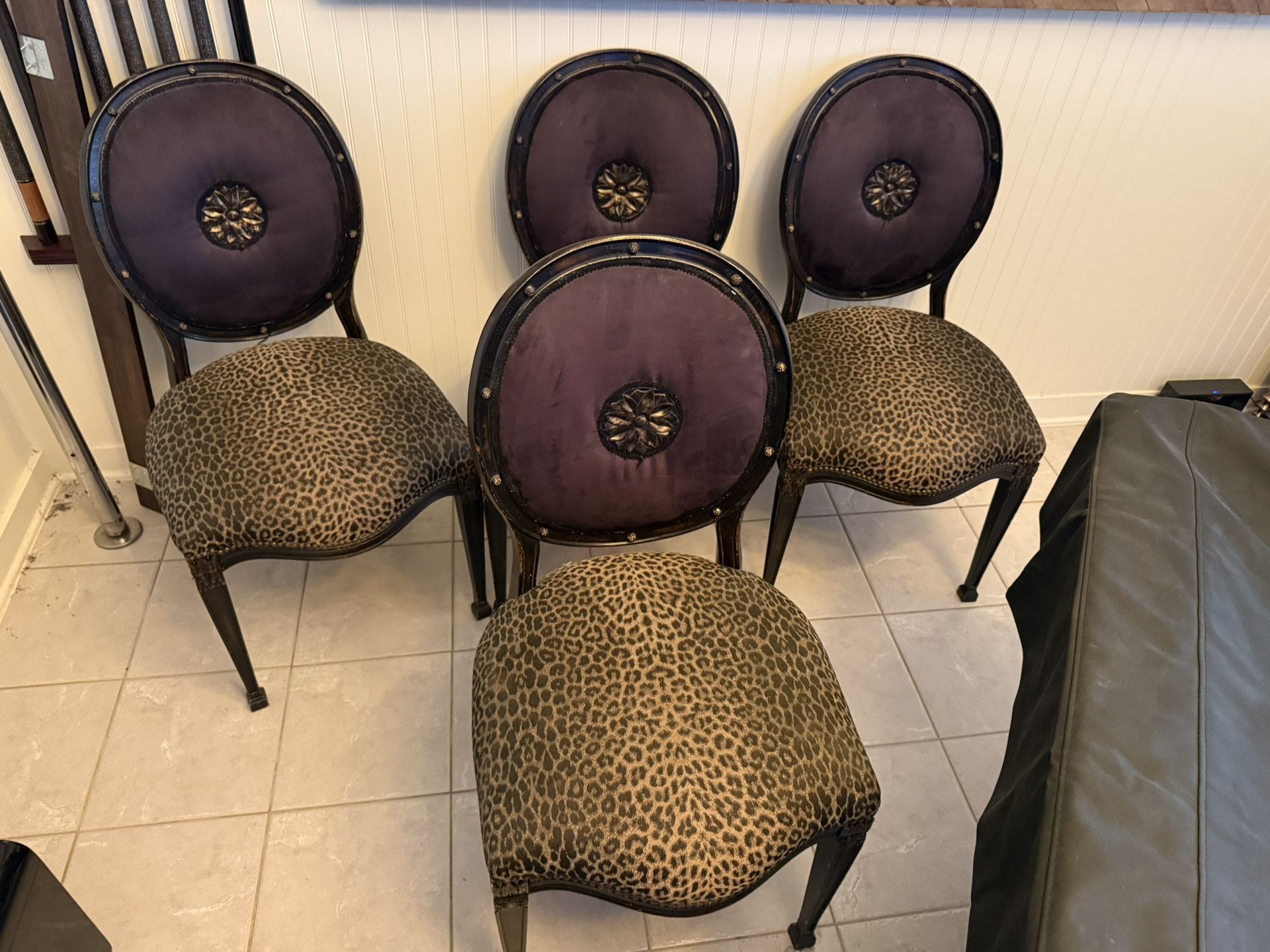 Purple Suede And Leopard Chairs 4 Count Very nice condition Have all. 4 together Suede is nice. Leopard nothing wrong with cushions sit well. Nice additions