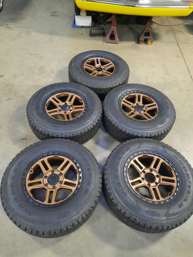 Selling New Alpha Grenade Bronze with Black Lip Wheels with Goodyear Wrangler All-Terrain Adventure Kevlar tires...asking price for set of 5... $2999...if interested please contact us ...will not fit Sport Broncos Available Size LT275-70-18 Load Range E Wheel Size & Fitment 18x9 25mm offset Wheel Lug Bolt Pattern 6x139.7mm