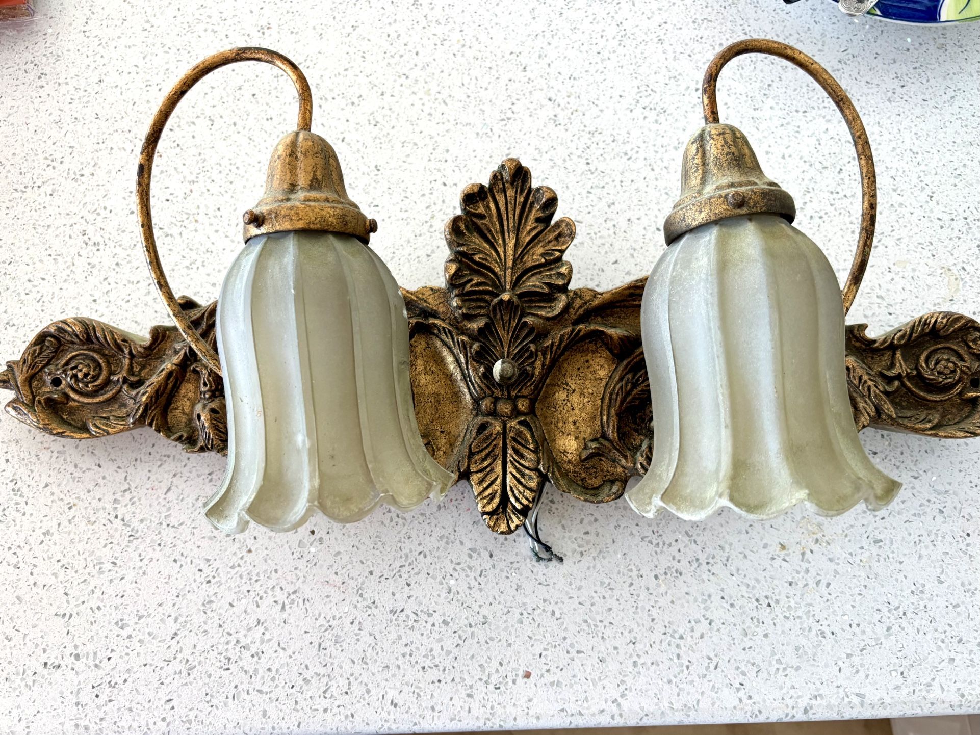Remodeled the bathroom so this has to be rehomed. Measures @ 23” wide in a gilt finish . Lost 2 of the shade screws in the process but should be an easy fix. Needs to be cleaned up a bit. Can meet in Boca.