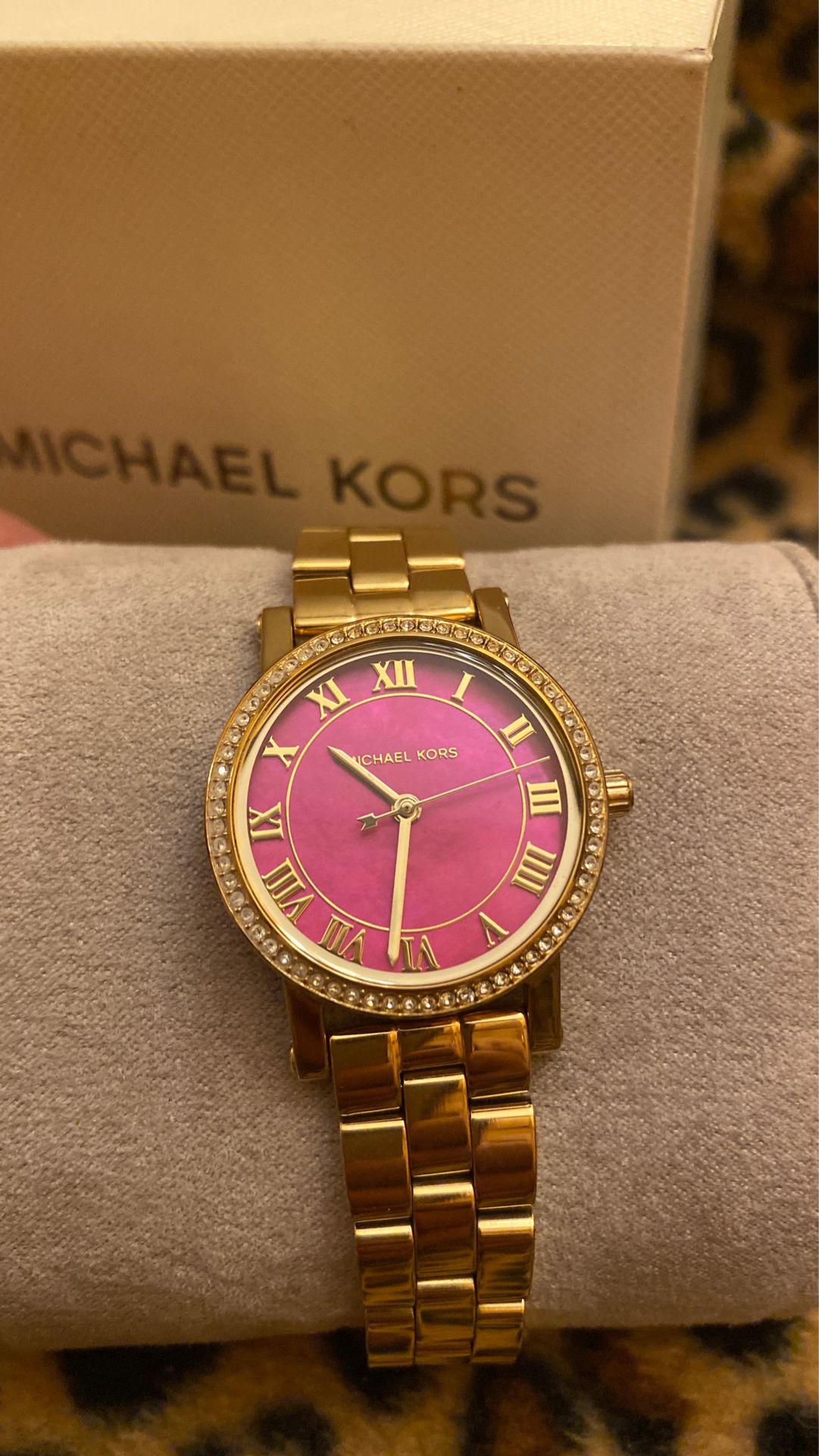 A radiant gold-tone bracelet and red sunray dial highlight this striking timepiece from the Petite Norie collection by Michael Kors. Gold-tone stainless steel bracelet with deployant buckle Approx. strap circumference: 175mm +/- 5mmRound case, 28mm Red sunray dial with Roman numerals, three hands and Michael Kors logo