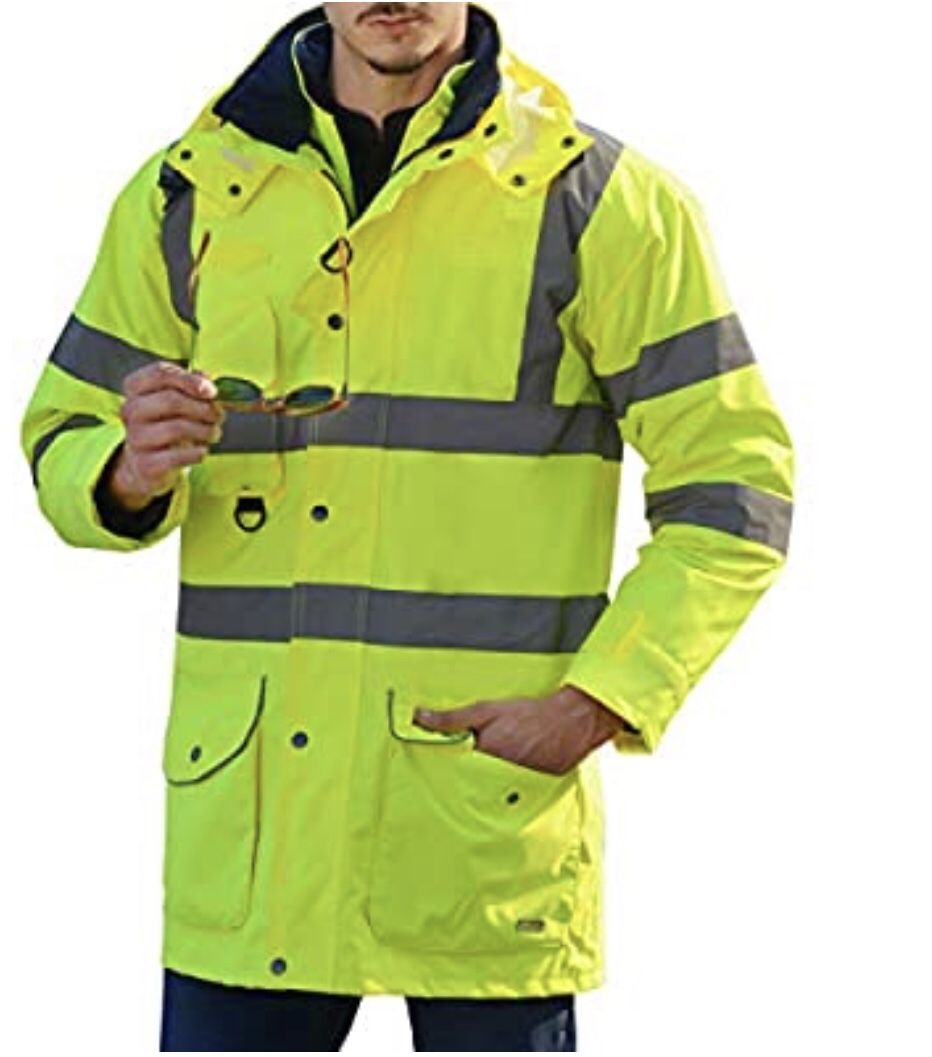 Holulo brand Waterproof neon yellow 7” in-1 reflective class 3 safety Parkea bomber jacket with zipper and pockets with removable hat Available size L and XXL