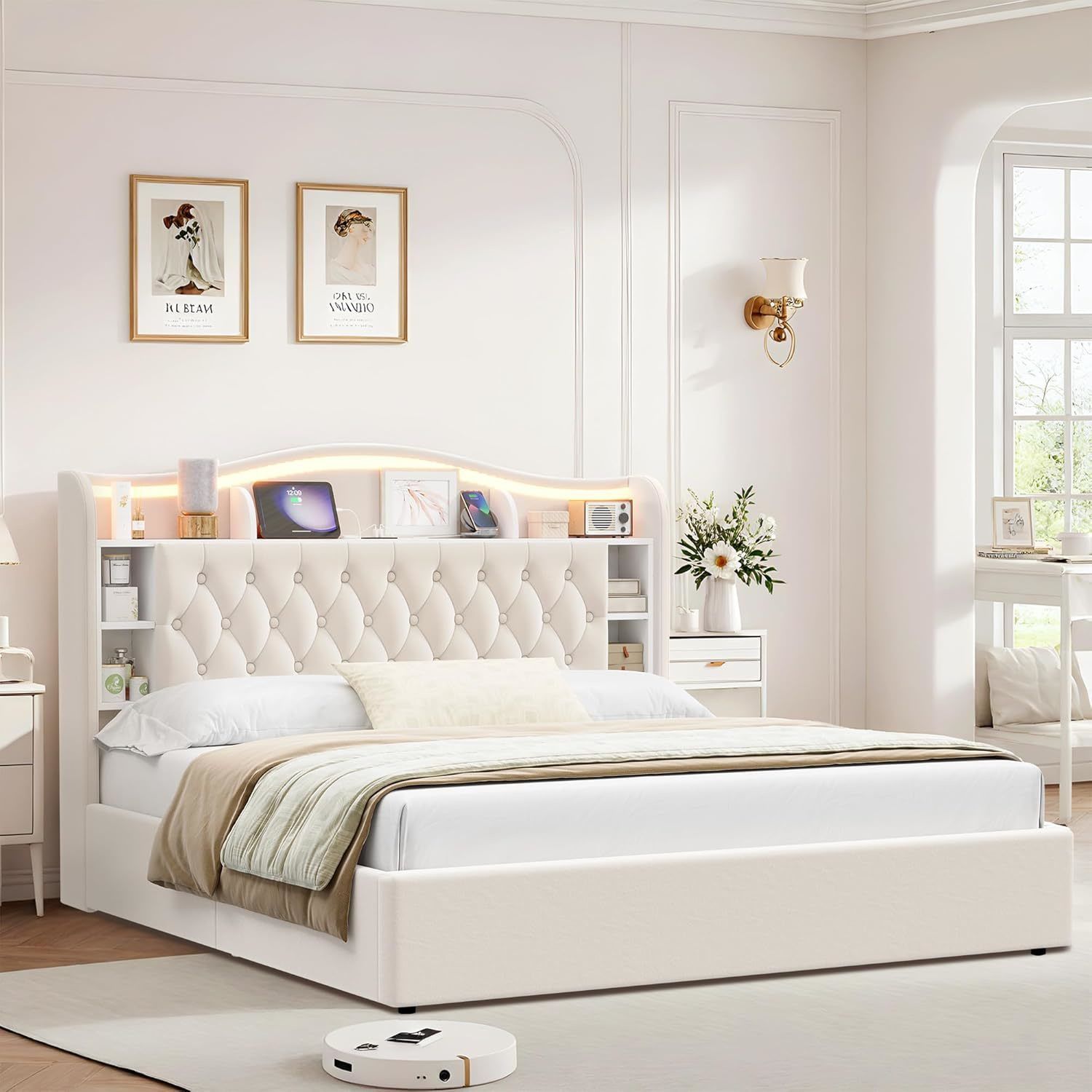 B228 $170 Queen Size Bed Frame Hydraulic Lift up Storage Bed Frame with LED Lights & USB Outlets, Comfort Upholstered Headboard with Storage Shelves, Slats Support No Box Spring Needed Platform Bed, Beige Material velvet Product Dimensions 85"L x 63"W x 47.6"H Style Modern Special Feature Charging Station, LED Lighting, No Box Spring Needed, Slatted, Upholstered Color Beige Spacious under-bed storage : The large storage compartment beneath the bed is perfect for storing items such as bedding, pillows, seasonal clothing, shoes, or other household items. Moreover, the storage shelves on the headboard are great for trinkets and extras toys to keep the clutter out the room. Hydraulic lift up bed: The hydraulic system allows for quick and easy access to your stored items, making it a convenient option for everyday use. There is easily lifting the bed frame with the mattress and everything in place. Once the underneath storage area is open, the hydraulics keep it sturdily in the open position. The bed also closes softly for the lifting part. Bright lights & USB outlet: The LED lights are super bright and can change the colors. The lights make the bed frame look so much prettier. It lights up beautifully and it's gorgeous addition to your room. There are also outlets on the headboard that is convenient for you to charge all of devices. Sturdy platform bed: Mattress slat supports are close enough together, no box spring needed. The planks individually snap into the frame to prevent anything from moving. Although lifting and lowering for the storage may be a bit heavy, the bed frame is solid with no squeaks or wobbles. Easy to assemble: The bed frame is easy to assemble and comes with all tools. The hardware and all of parts were labeled with numbered stickers which corresponded to images in the instructions. For as long as you own this bed frame we will ensure it continues to deliver on quality and comfort. klv-up-328