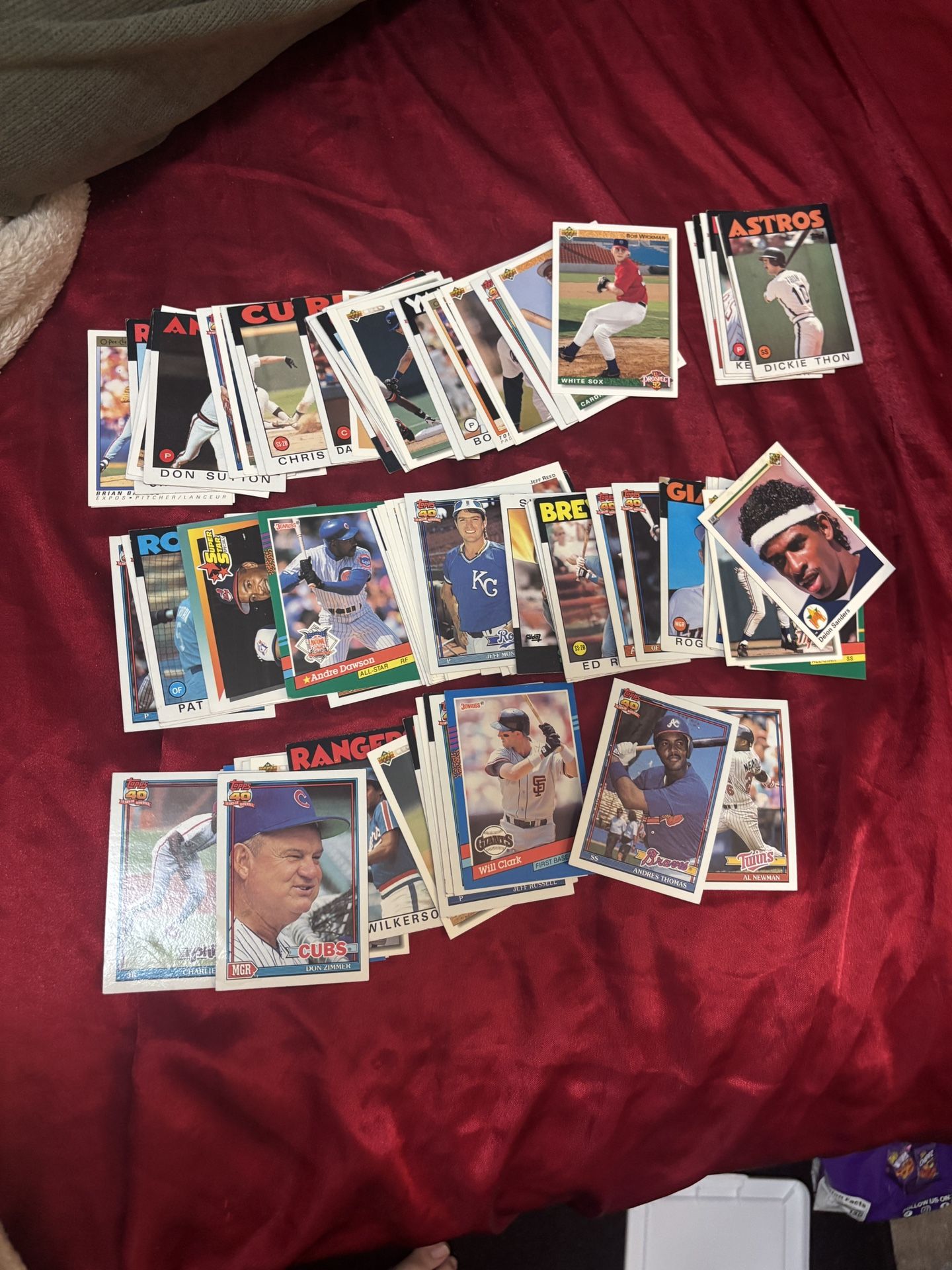 Approximately 1170 cards inside of storage box. I could be a few off most likely more inside. About 95% of the cards are in great condition as they’ve been in storage since the late 80s. Each card values up to $2. Keep in mind this is without grading which can be flipped for a profit for up to hundreds of thousands per card because they are in great condition. These can also be more vintage cards added to your collection. Either way my pricing is a good deal in my opinion and I will not reply to any low ballers. Please reach out if you’re interested thanks.