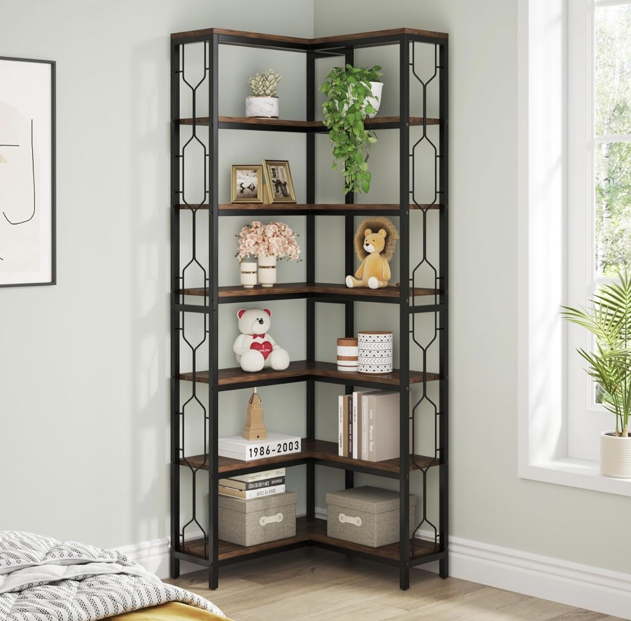 new assembled Corner Shelf, 7-Tier Industrial Corner Bookshelf, Wood and Metal Corner Etagere Bookcase, Freestanding Display Shelf for Living Room, Ki