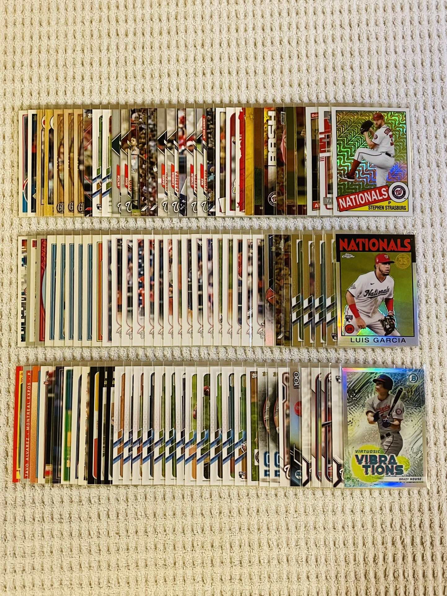 Washington Nationals 100 Sports Card Team Lot! All cards in mint condition! Rookies, prospects, All-Stars, HOFers, inserts, parallels, variations & more! Mix of Topps & Panini. Topps Chrome, Series 1, Series 2, Update Series, Bowman, Gypsy Queen, Stadium Club, Stadium Club Chrome, Donruss, Donruss Optic, Diamond Kings, Opening Day, Heritage & more! Luis Garcia, Victor Robles, Stephen Strasburg, Patrick Corbin, Josiah Gray, Carter Kieboom, Riley Adams, Keibert Ruiz, Lane Thomas, Joan Adon, A.J. Alexy, Sean Doolittle, Mason Thompson, Brady House, Andry Lara, Roismar Quintana, Max Scherzer, Juan Soto, Bryce Harper, Trea Turner, Vladimir Guerrero, Tim Raines, Andres Galarraga & much more! $40 for the lot! Local pick up & shipping available. Message for details. Thank you!