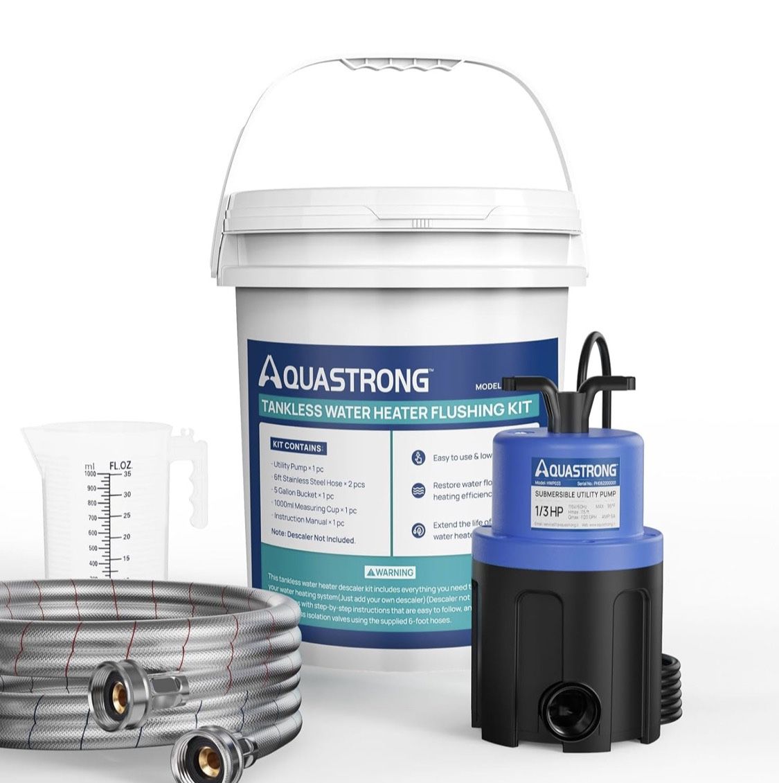 New and unused! Still in box see photos Aquastrong Tankless Water Heater Flushing Kit, 1120 GPH Submersible Utility Pump, 3/4"GHT 6FT Stainless Steel Hoses x2, 5.3 Gal Bucket, 1-Qt Measuring Cup, Corrosion-Resistant Flush Pump for Descaling D