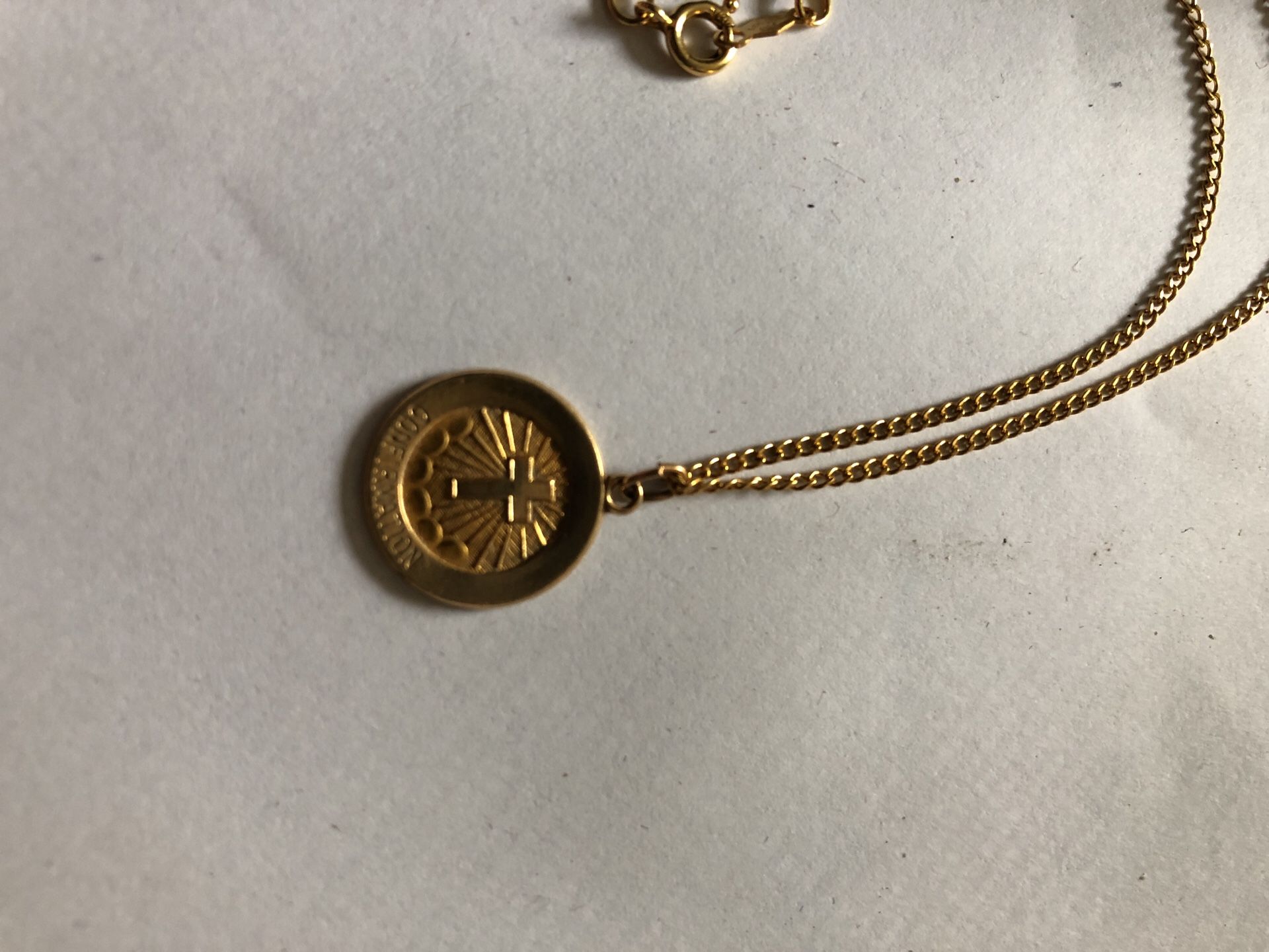 This is a confirmation 14K gold pendant that is on a gold filled necklace