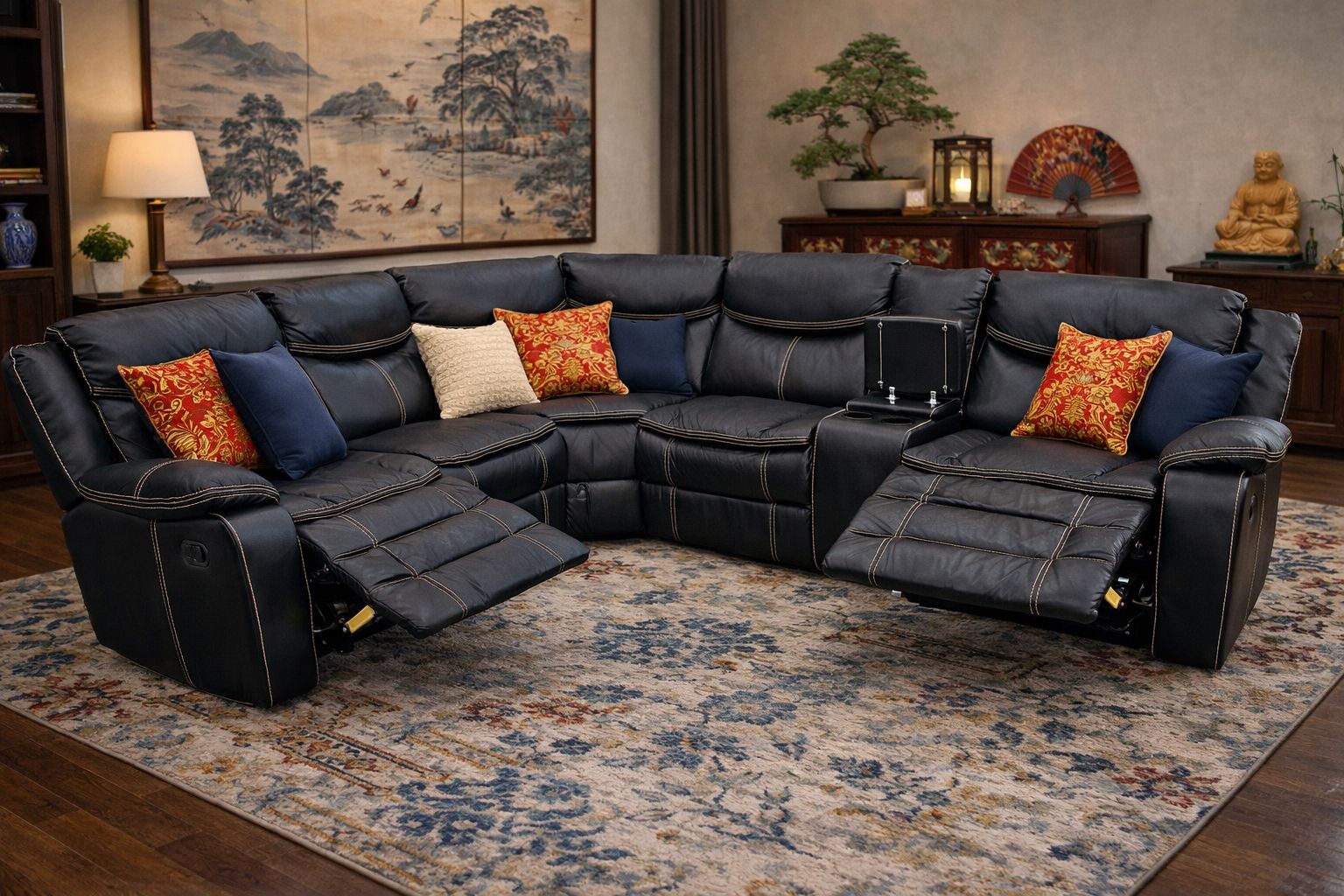 🖤 BEAUTIFUL BLACK LEATHER DUAL RECLINER SECTIONAL 🔥 FREE DELIVERY 🚚 Upgrade your living room with this large, comfortable black leather sectional featuring dual manual recliners on each end—perfect for relaxing, movie nights, or entertaining guests. This sectional is preowned but still in very good condition with lots of life left. Both recliners work perfectly and smoothly. It does show light normal wear on a couple of headrests and seat cushions, but nothing major at all—still looks great and functions exactly as it should. ✨ DETAILS & FEATURES: ✔️ Dual manual recliners (both ends) ✔️ Built-in center console with cup holders ✔️ Super comfortable and spacious seating ✔️ Durable black leather with contrast stitching ✔️ Perfect for large living rooms or family spaces 🧼 This sofa comes from a very clean and conservative home 🧽 Professionally cleaned, sanitized, shrink-wrapped, and stored—ready for its new home 💰 Original Retail Value: $2,999 🔥 Get it here for a fraction of the price! 🚚 FREE LOCAL DELIVERY INCLUDED 📦 Multiple staging photos available so you can see how it looks in different settings 📲 Message me anytime—first come, first served!