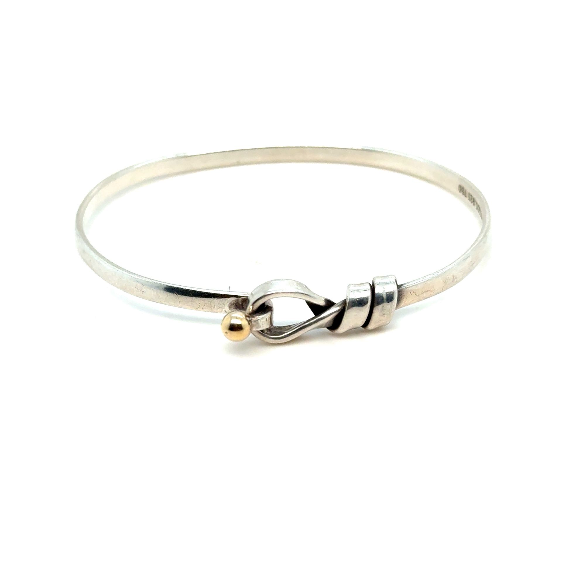 SPECS: Metal: 18k Yellow Gold/ Sterling Silver 925 Size: See Photo Condition: Preowned Authentic Tiffany & Co. Hook On Bangle in Sterling Silver & 18k Gold Setting No original packaging included. Note: Pictures are enlarged to show fine details of the product