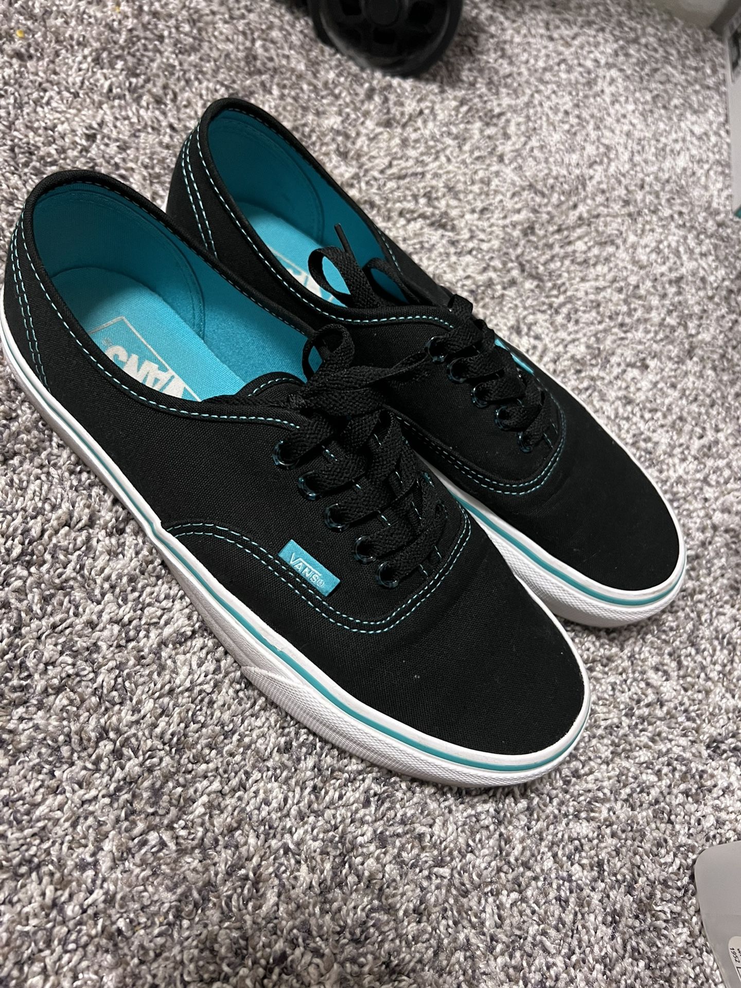 Black and teal color vans. Worn 1-2x. Mens size 7.5. Womens size 9