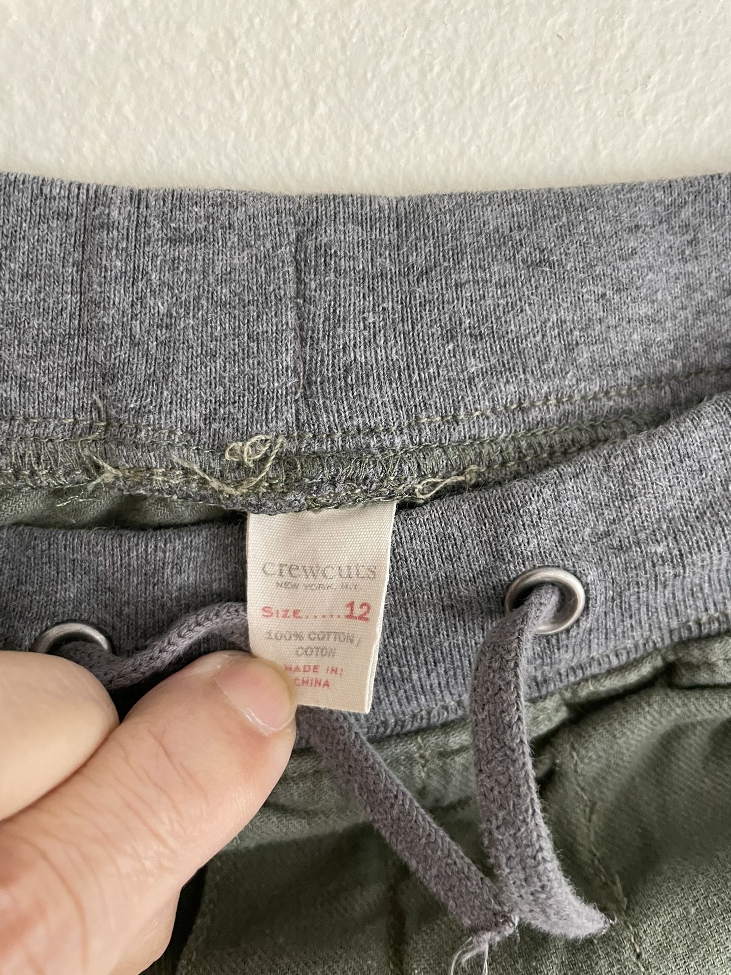 This is a children's casual cargo pants (Cargo Joggers). • Size: The label indicates it is Size 12, which is usually suitable for children aged 10-12. • Material: 100% pure cotton (100% Cotton), this material has good breathability and is comfortable to wear. • Origin: Made in China. 2. Design features • Style: Combines the characteristics of cargo pants and joggers. • Waist: Features a grey ribbed elastic waistband and a drawstring for easy on and off as well as adjusting the tightness. • Pockets: There are two large hand pockets on the front, a cargo pocket with a flap on the side, and two patch pockets (one with a button) on the back. • Cuff: There is a closing design (buckle) at the bottom of the pants, which is the typical style of Joggers. • Color: Olive Green / Khaki Green. Suggestions • Washing advice: As it is 100% pure cotton, it is recommended to wash in cold water to prevent shrinking. • Matching suggestions: This pair of pants is very versatile and suitable for pairing with simple T-shirts, hoodies, and sports shoes. It is perfect for daily school or outdoor activities.