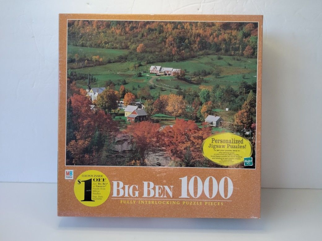 Big Ben, Fully Interlocking, 1000 Piece Jigsaw Puzzle from Milton Bradley Hasbro. Puzzle features a landscape scene of East Orange, Vermont. Vintage puzzle produced in 1999. Ages 12 to Adult. Size Complete: 20-1/2" x 26-3/16" (51.12 x 66.52 cm) Brand New and Sealed.