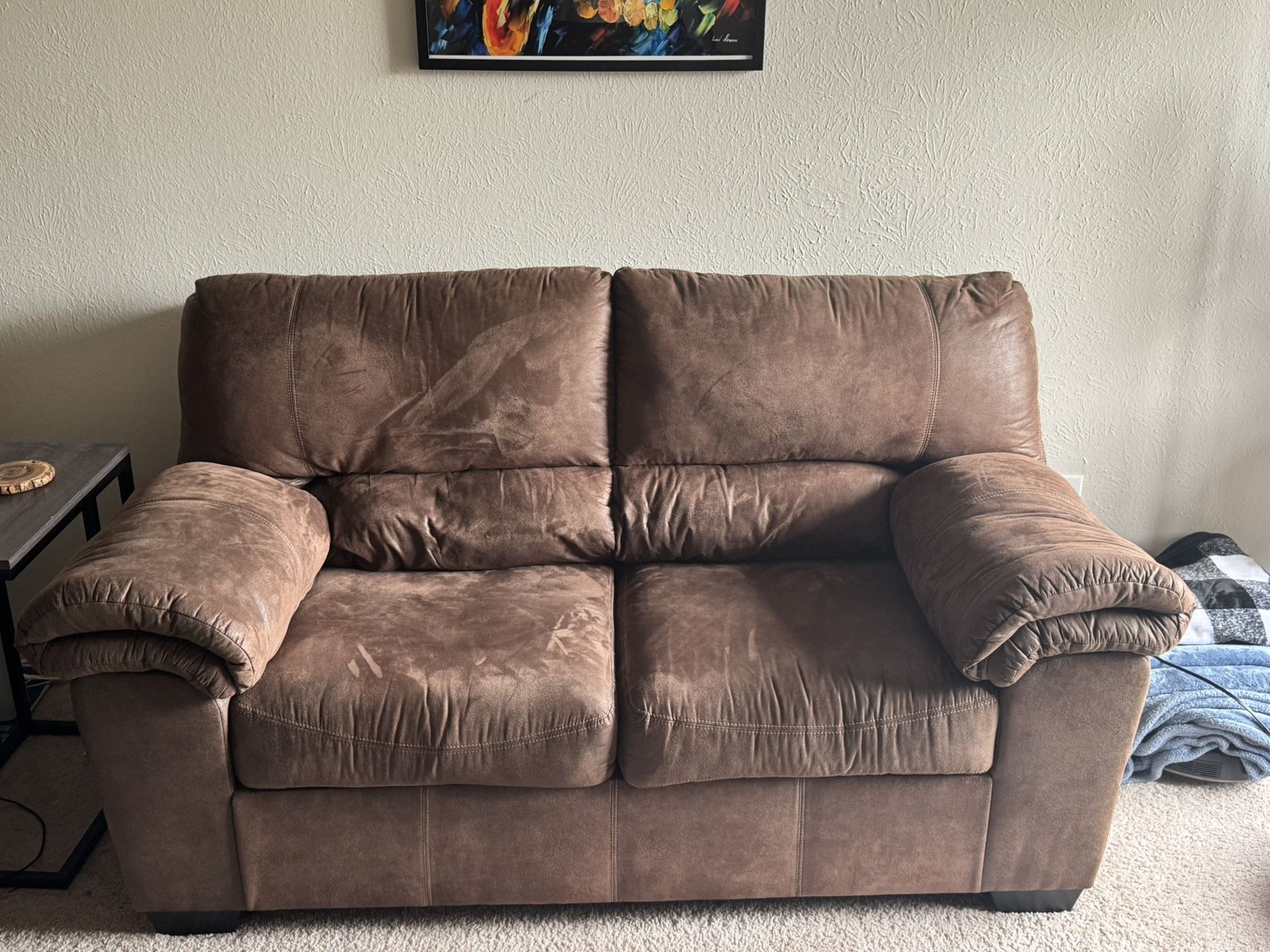 Comfortable brown loveseat for sale. Soft microfiber material with wide padded armrests and deep cushions — perfect for a living room, apartment, or office space. Measures approximately 5 ft wide and 33 inches deep, making it a great size for smaller spaces while still being roomy and cozy. In great condition . No rips or structural issues. From a clean, smoke-free home. Asking $100 OBO. Must pick up. Located near SMU in Dallas