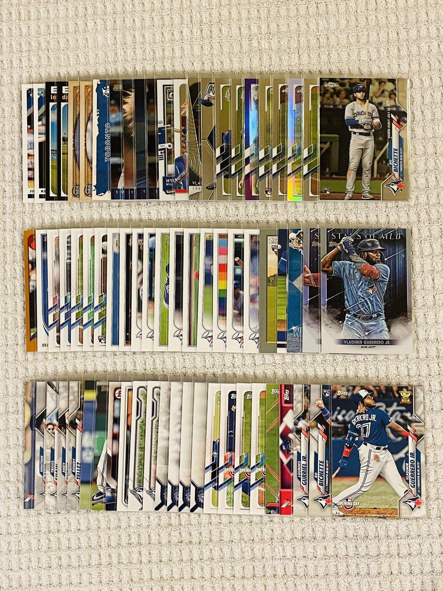 Toronto Blue Jays 70 Sports Card Team Lot! All cards in mint condition! Rookies, All-Stars, HOFers, inserts, parallels, variations & more! Mix of Topps & Panini. Topps Chrome, Mosaic, Prizm, Donruss, Donruss Optic, Stadium Club, Stadium Club Chrome, Series 1, Series 2, Update Series, Bowman, Opening Day, Gypsy Queen, Heritage, Diamond Kings & more! Vladimir Guerrero Jr, Bo Bichette, George Springer, Lourdes Gurriel Jr, Cavan Biggio, Danny Jansen, Santiago Espinal, Nate Pearson, Hyun-Jin Ryu, Jose Berrios, Roberto Alomar & much more! $28 for the lot! Local pick up & shipping available. Message for details. Thank you!