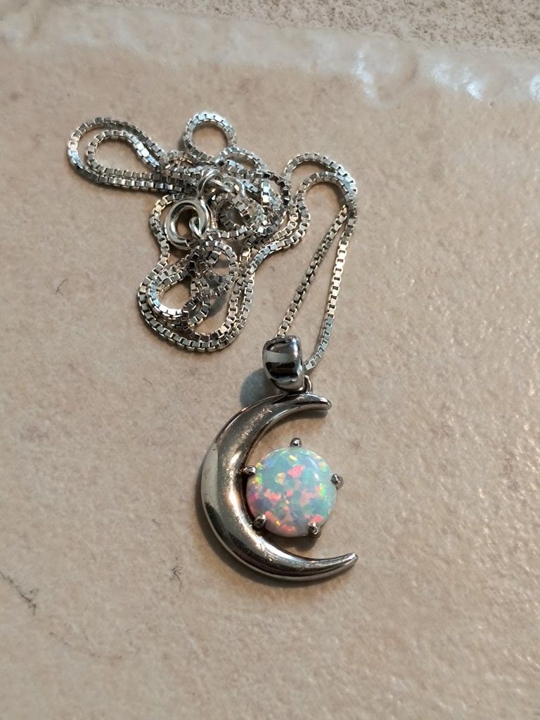 Sterling silver chain and base. Lab grown opal.