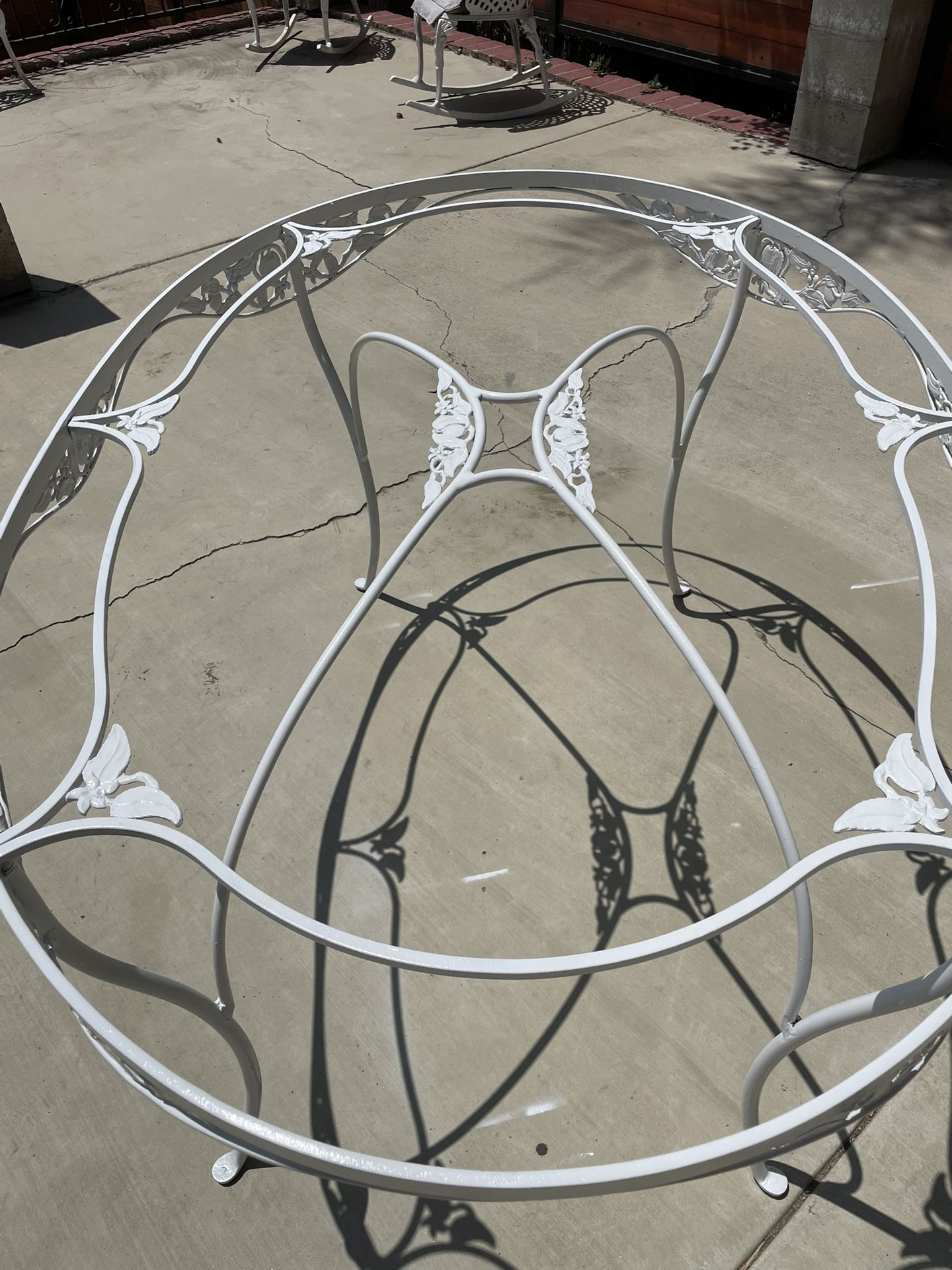 Beautiful floral pattern . Painted then never used. Glass top is included. Will seat 4-6 and measures about 48” oval.