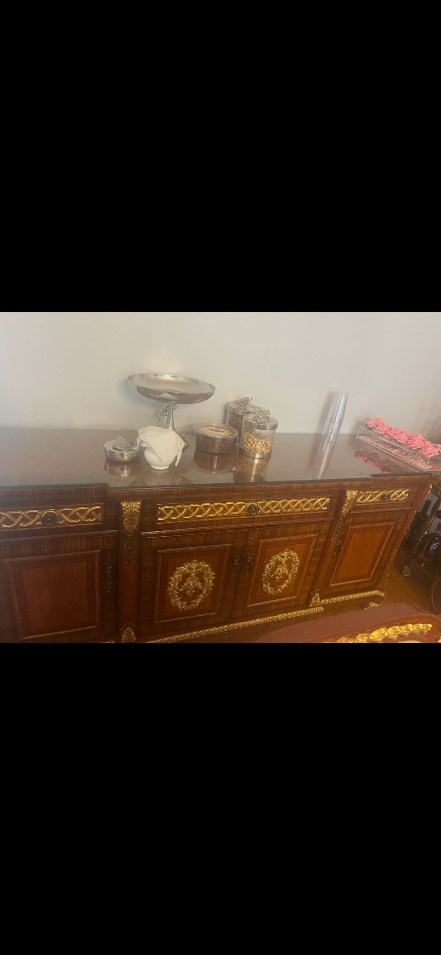 Beautiful, high-end buffet/sideboard in excellent condition. Made from rich solid wood with detailed gold trim, ornate carved accents, and decorative wreath motifs on the doors. The piece includes a thick custom glass top for protection. Very heavy and well-made — perfect for a formal dining room.