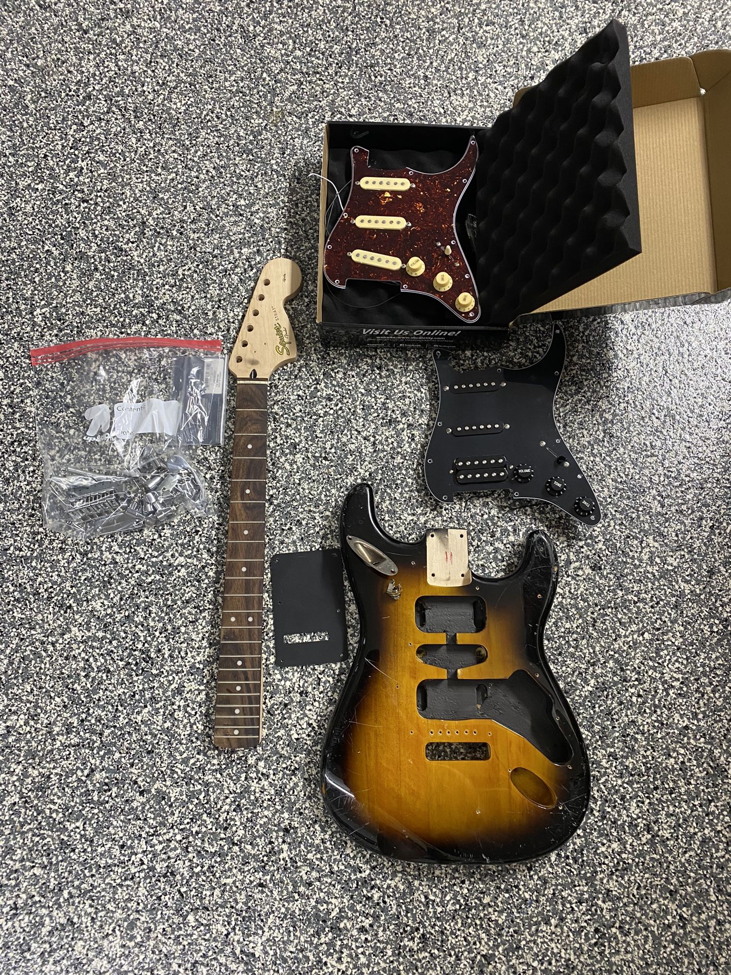 Full Squire custom build ready to go, selling because I just don’t have the time. All squire Strat HSS parts included (all hardware) plus the following: -Aged vintage guyker jack plate - new -Musiclily Pro SE prewired SSS pick guard-new -Fender string trees -new -Aged vintage guyker tremolo bridge -new Body is scratched, dinged, and chipped. Good for a relic look or ready to be refinished. All you need to do is build it and put strings on it. $225 for all of it. Cash only. Pick up only. Located in Santee.
