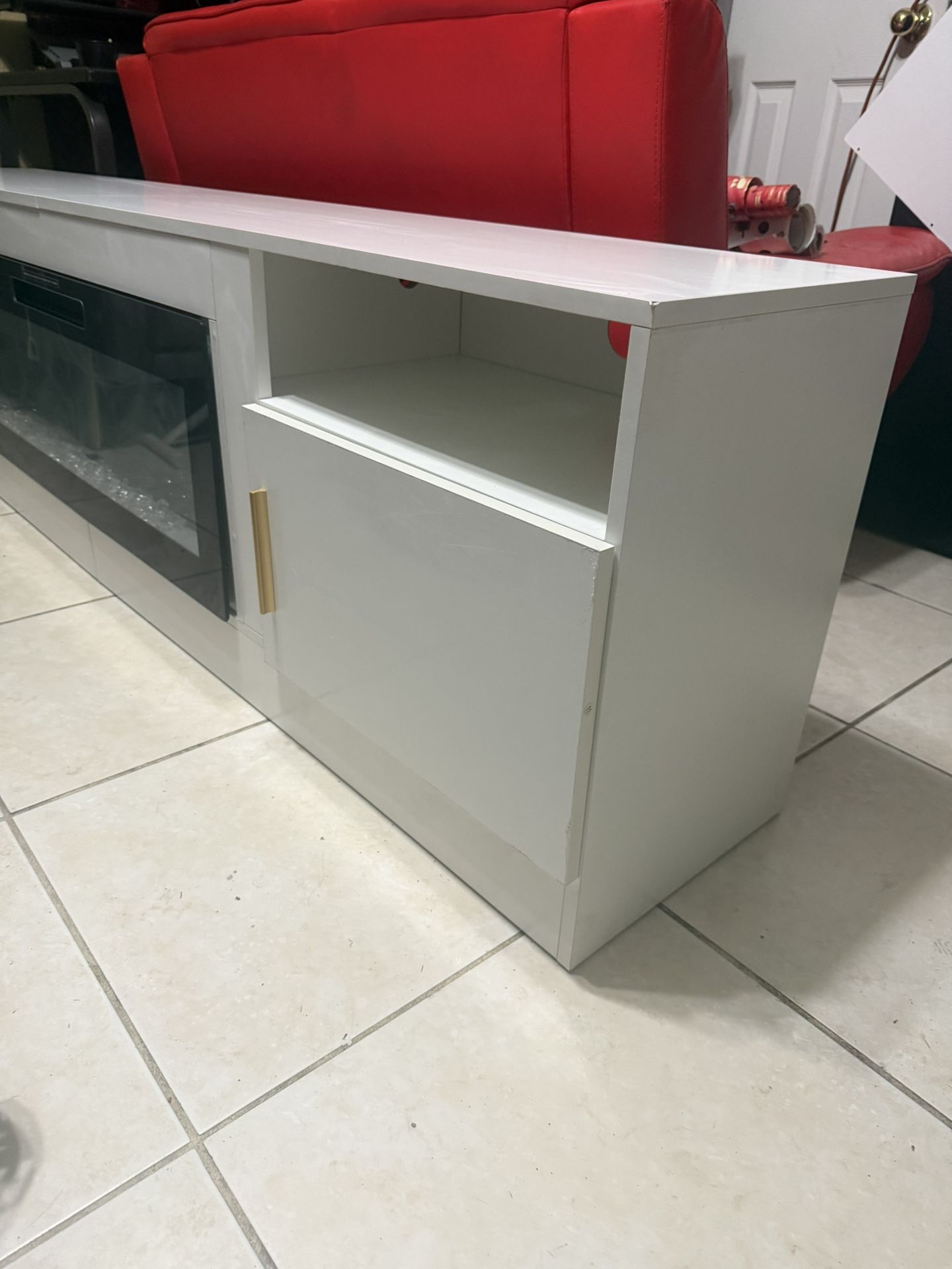 Selling a beautiful modern white entertainment center with a built-in electric fireplace. It has a sleek glossy finish with gold handles and glass front on the fireplace. Perfect for a living room, bedroom, or apartment setup. The unit has storage cabinets on both sides to store consoles, movies, or other items. The fireplace gives a cozy look and modern vibe to any space. Condition: Good condition, clean and well kept.