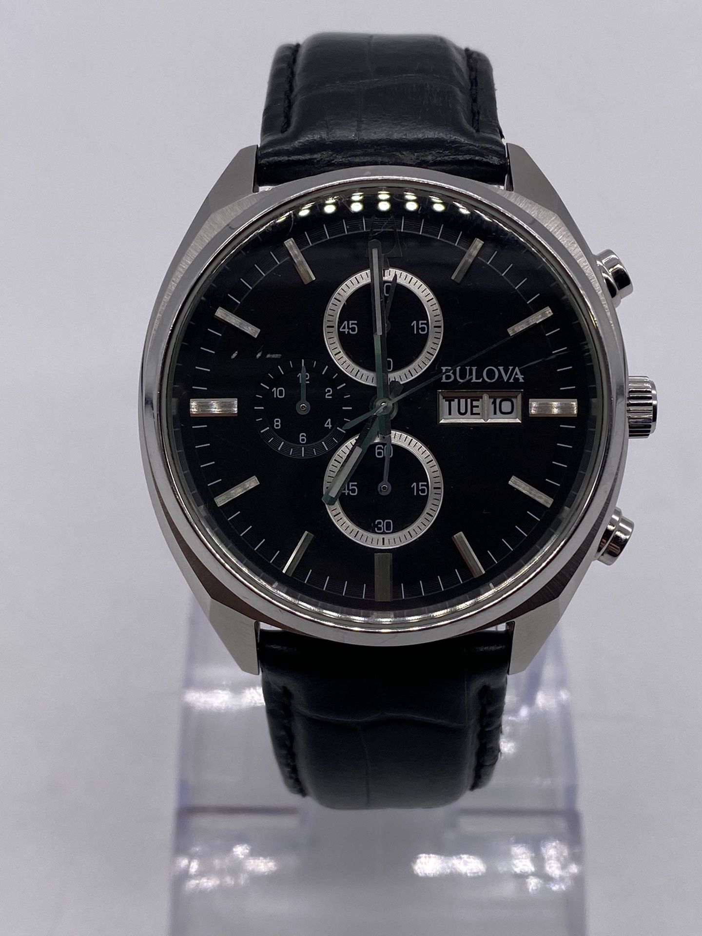 Men's Bulova Surveyor Quartz Chronograph Black Leather Strap Watch 96C133 used Good condition