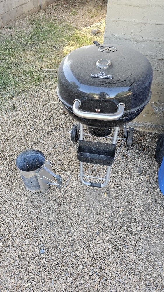 Master Forge Charcoal Grill. Used 6 times. Comes with lump charcoal, chimney starter and utensils in photos. Wire rack not included because it broke.
