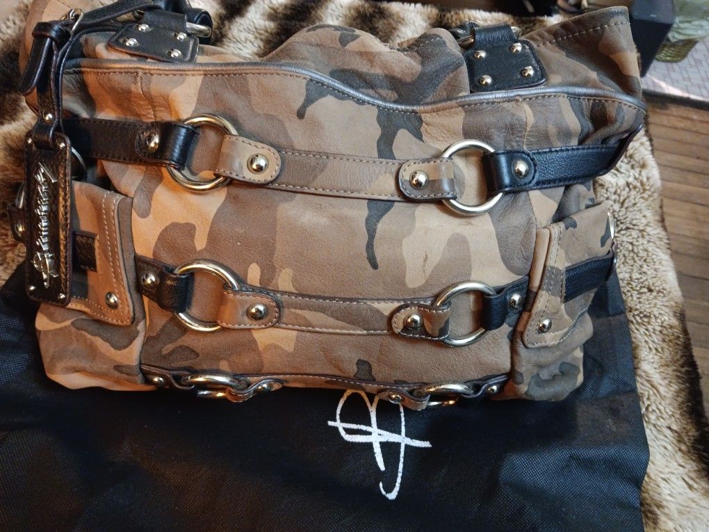 Soft butter Leather, camo browns & green. Outside of bag has 1 slotted pocket & 2 magnetic close pockets (1 pocket on each side of bag) Inside of bag-1 zippered pocket & 2 slotted pockets & magnetic closure. Measurements: Height 11" - Width 15" - Strap Lenth 9"