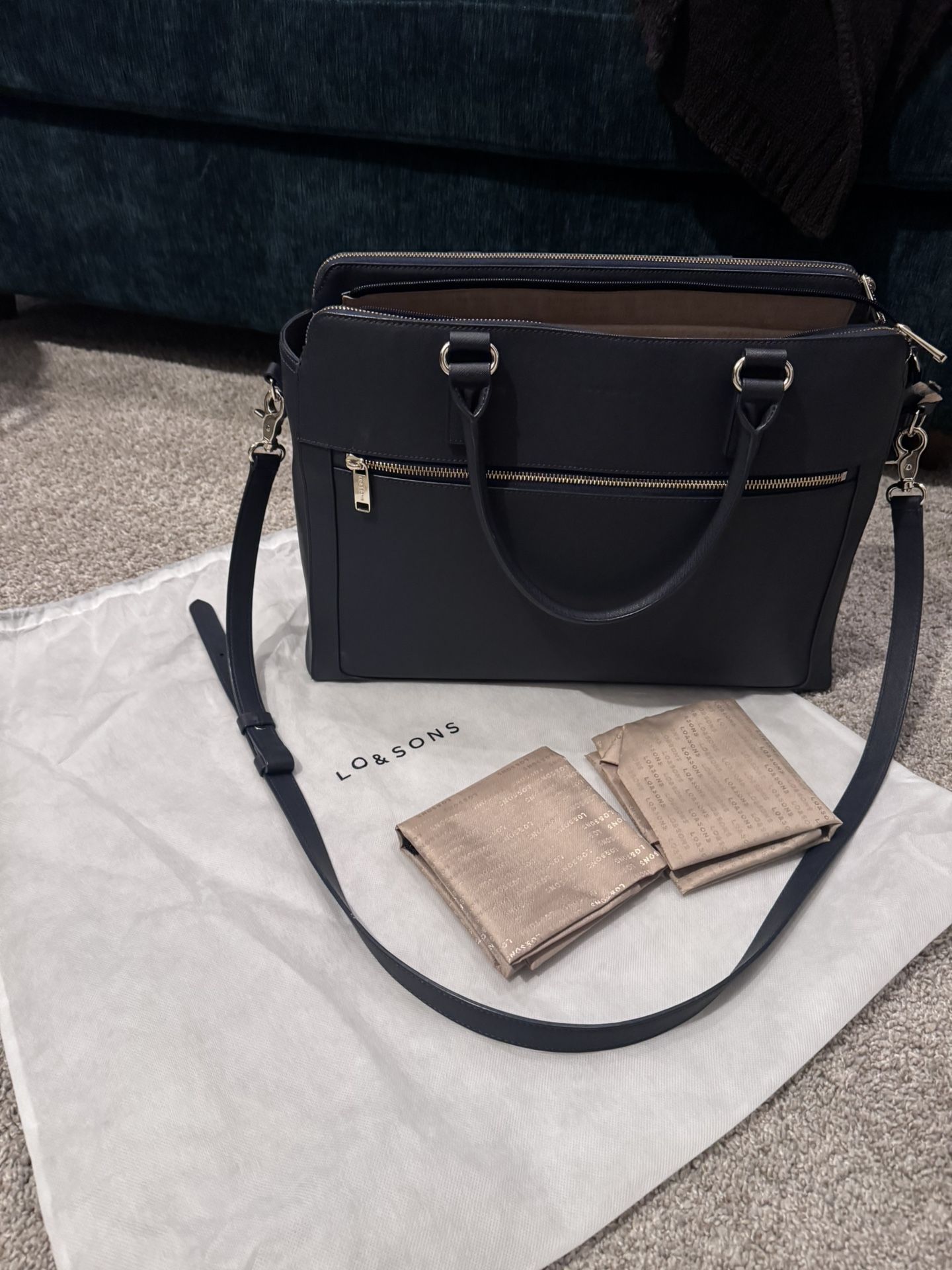 This bag is made of dark blue recycled saffiano leather, and its size large (16.5 x 5.3 x 11.8”). It has lots of useful pockets and fits a 16” laptop. Has a sleeve to attach to rolling luggage. Includes two shoe pouches. Retails for $370. https://offerup.com/redirect/?o=aHR0cHM6Ly93d3cubG9hbmRzb25zLmNvbS9wcm9kdWN0cy90cmluaXR5LXJlY3ljbGVkLXNhZmZpYW5vLWxlYXRoZXItZGFyay10YW4tZ29sZC1jYW1lbD92YXJpYW50PTQxMzYzNzgwNjY1NDQw It has a fixable tear near one of the straps (see photo), but is otherwise in great condition. I’m selling it because I decided to carry a backpack instead.