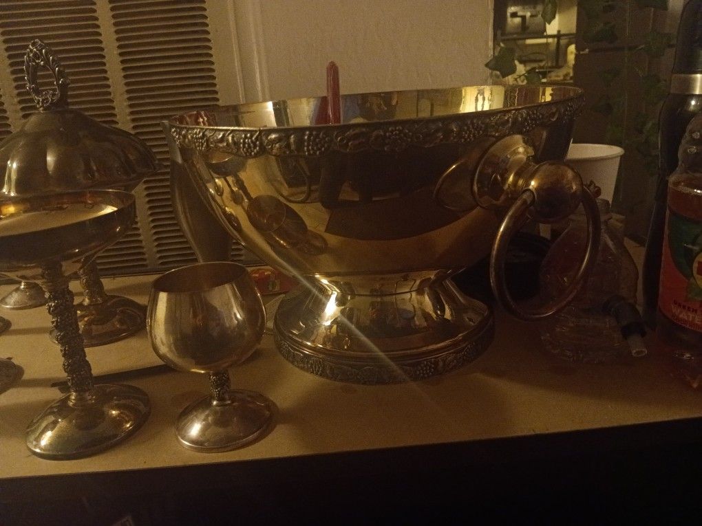 Full set of various size cups to go with punch bowl & ladle. Grapevines on the stems of the glasses & the ladle & around the punch bowl. Antique looking silver plated from Spain. Make offer