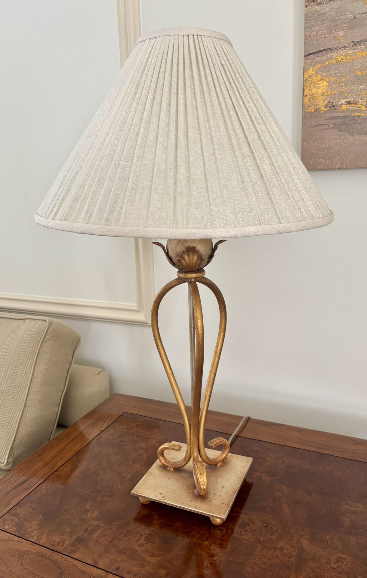 Beautiful table lamp Gold / bronze details Beige shade. Have another listing with a matching floor lamp. Approximate 31” h x 19”w Statement lamp