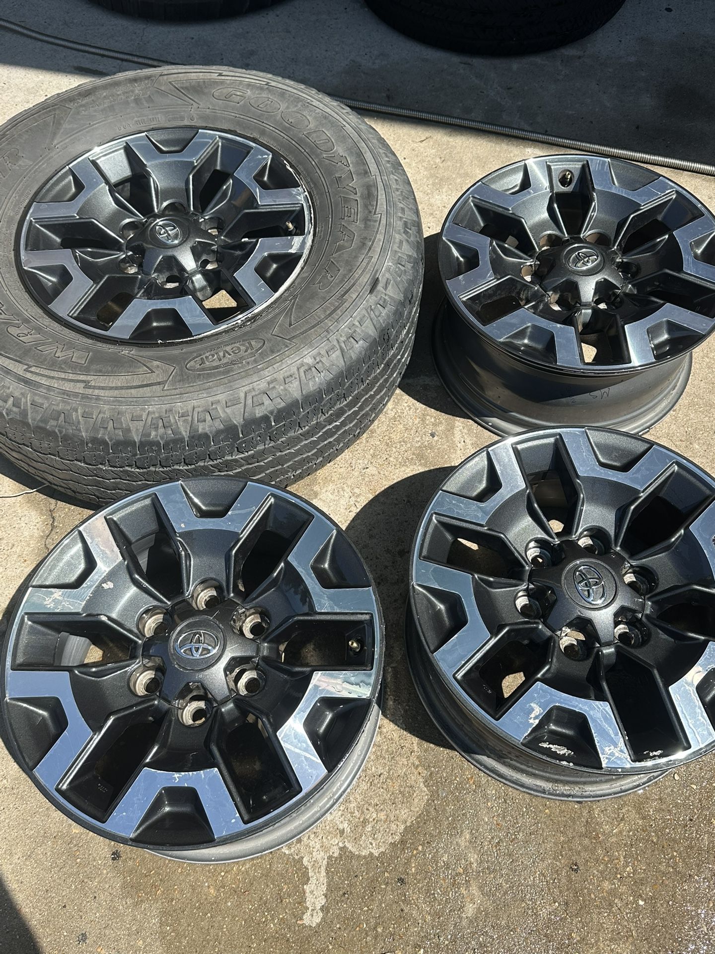 I am selling (4) used rims for the original Toyota Tacoma, measurements (16) as seen in the images, or if you prefer, I can sell them with tires if that is what you want. Vendo (4) rines usados para Toyota Tacoma original, medidas (16) como se ven en las imágenes, o si lo prefieres te los puedo vender con llantas si es lo que deseas.