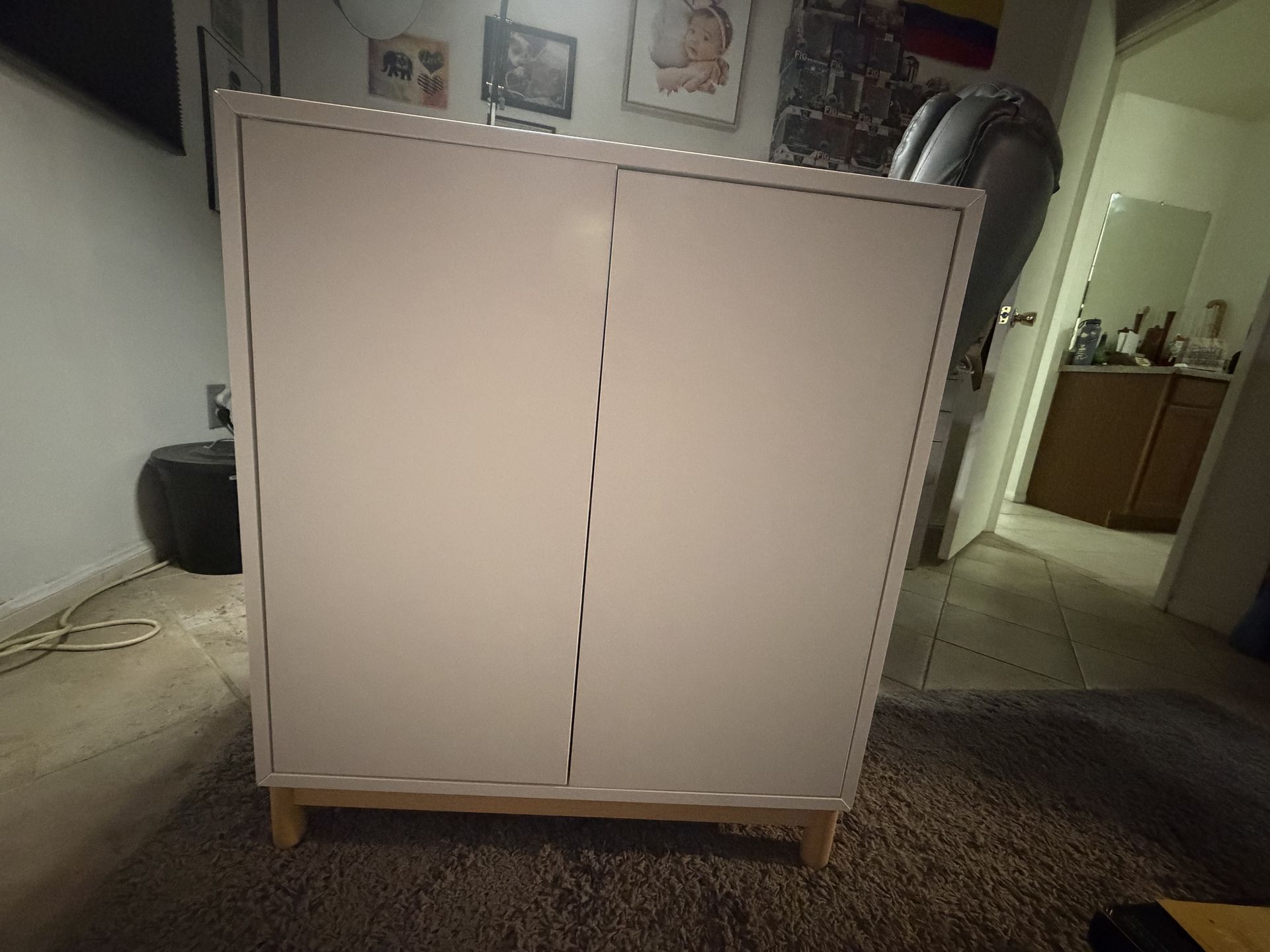 Moving and this won’t fit in the new place. The inside of the left door had stickers on it which were removed but some of the backing is still stuck. Otherwise the cabinet is is great condition. $40 Length 27.5 inches Depth 13.5 in Height 31in