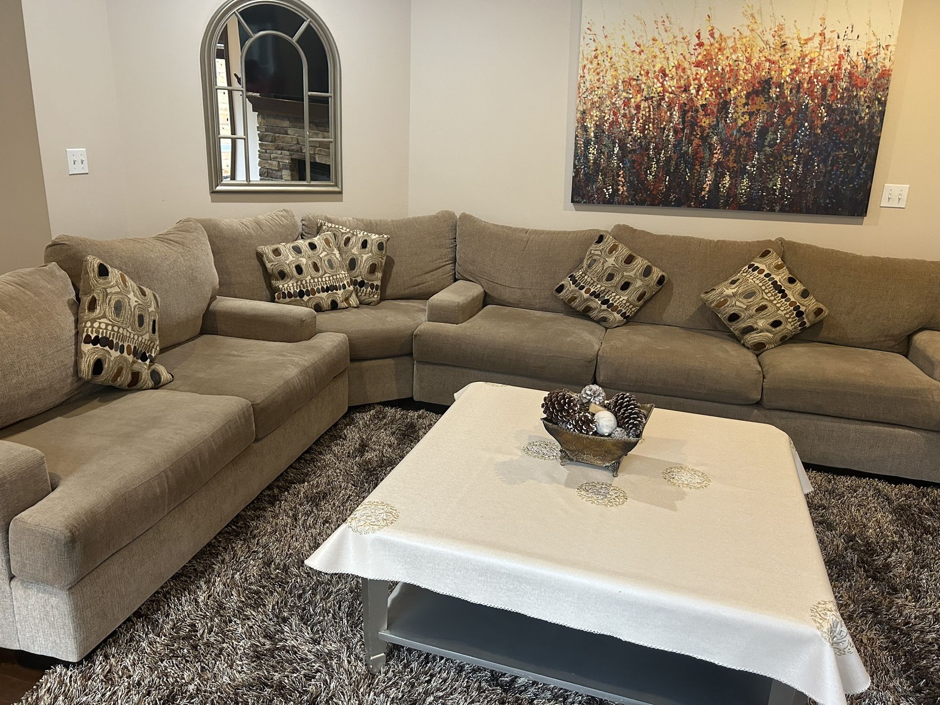 Entire couch set comes with the pillows Beige/ tan color Cat owners so some scratches on couch and sewing needed 250$ or best offer Rough measurements 3 seat couch: 97.5 in 2 seat couch: 69 in Corner middle piece -front: 15 in -back/curve: abt 65in