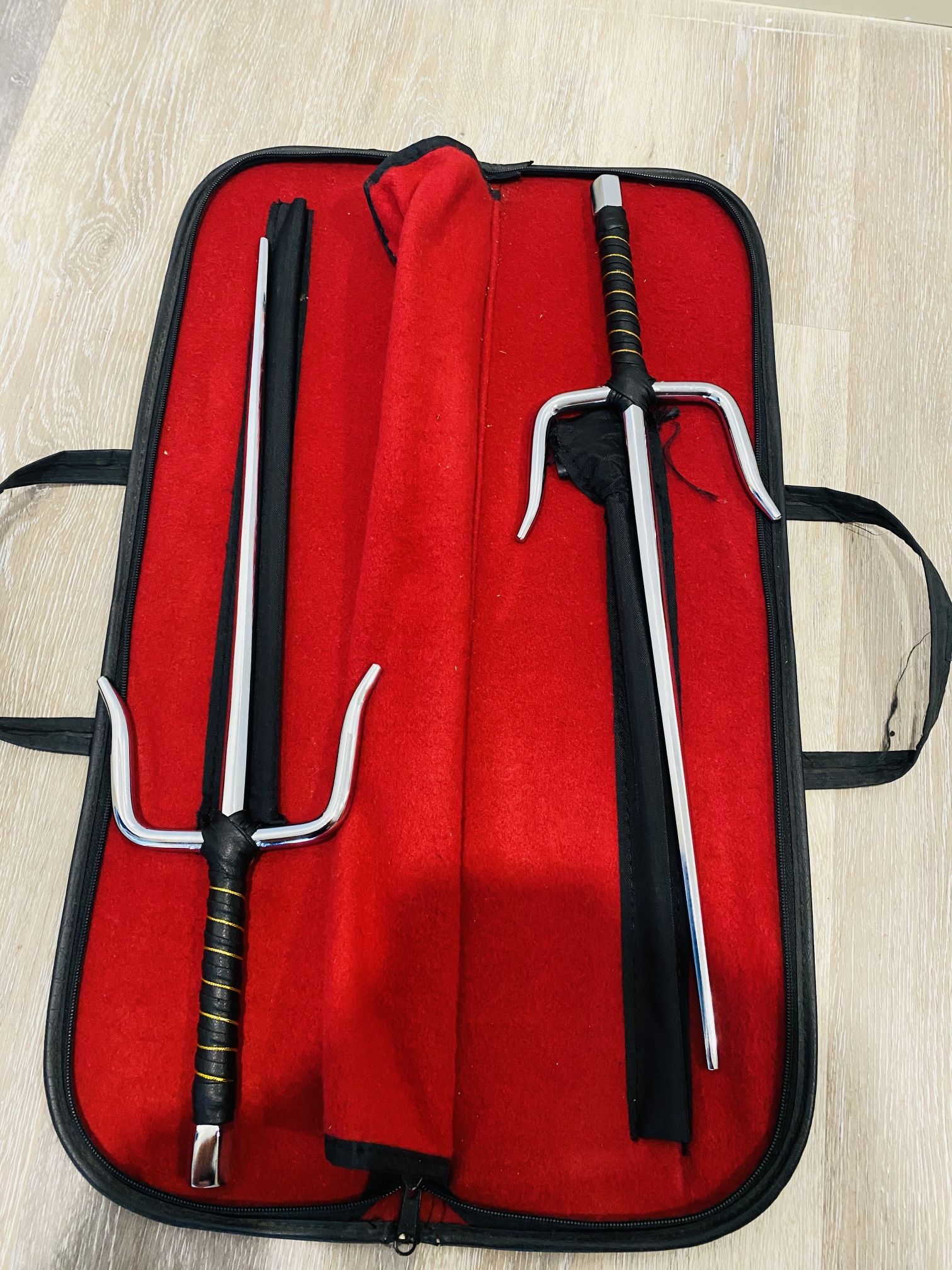 • Includes 2 sai (pair) and storage case • Approx. 19.5” length • Chrome metal construction with grip handles • Compact size – easy to handle • Great for practice, display, or collection • Pre-owned, like new