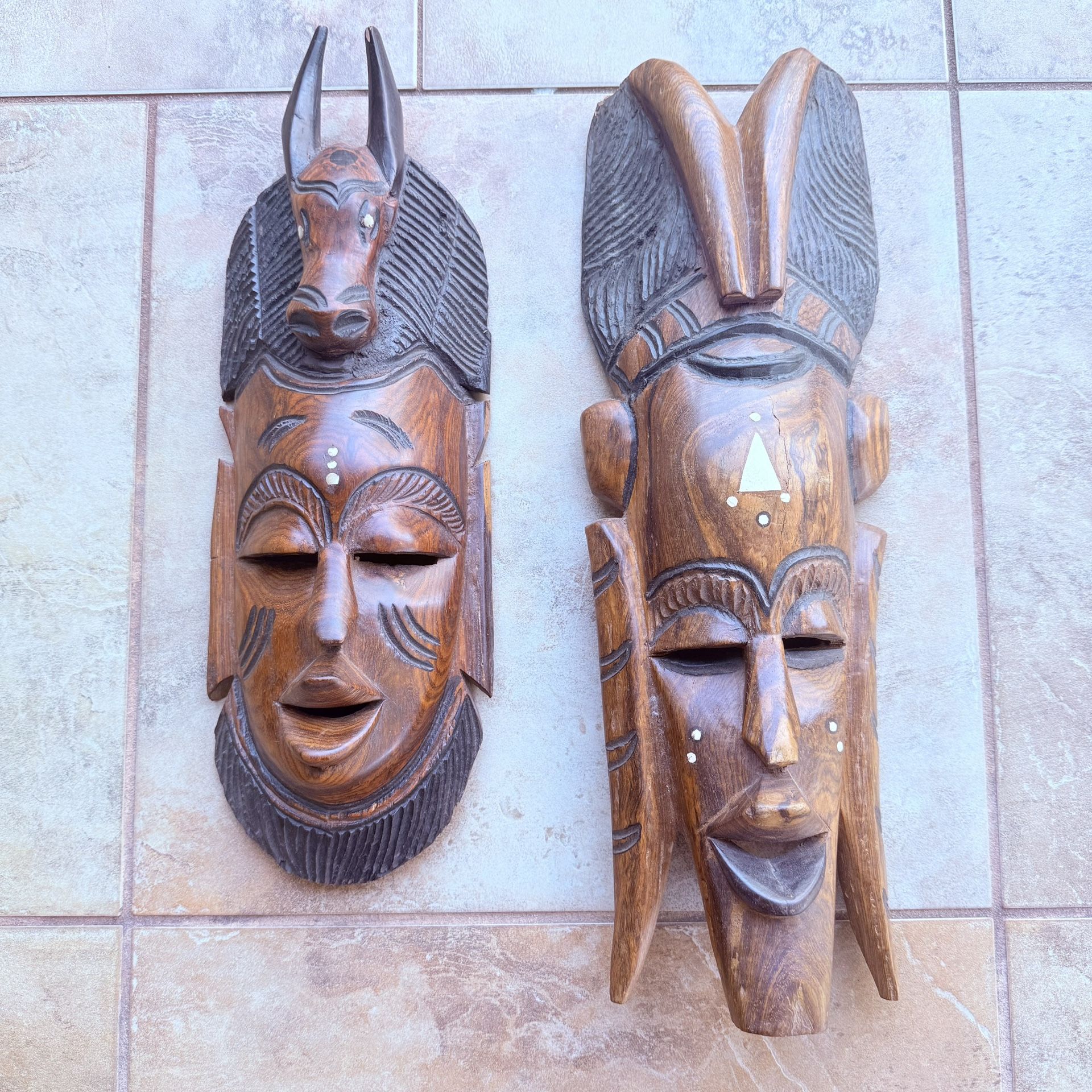Set of 2 Hand-carved wooden wall mask Tribal-Style Mask Wall Decor African-inspired, horned headdress They were brought from Spain. Beautiful hand-carved wooden decorative mask with a striking horned animal/antelope-style headpiece and detailed carving throughout (textured “hair,” facial markings, and inset eyes). It’s a bold statement piece for a living room, entryway, office, or gallery wall. Details: • Solid wood, carved and stained in rich brown/black tones • 3D design with raised horns/headdress • Has a hanging wire on the back for easy wall mounting Approx size: Height: 17.5” Width: 5.75” Depth: 3” Condition (please read): • Overall looks great from the front • Back shows age/wear and some cracking/splitting in the wood (see photos) • One horn tip has a small chip/wear Selling as-is — perfect for décor lovers, collectors, or someone who enjoys restoring/repairing wood pieces. Hand-Carved Wooden Tribal-Style Mask Wall Decor (Two-Tone + White Accents) • Vintage-Style Hand-Carved Wood Mask – Statement Wall Hanging • African-Inspired Wooden Mask – Tall Carved Wall Art Description Bring instant character to your space with this striking hand-carved wooden mask. It features an elongated face, bold carved details, and a dramatic two-tone finish (warm wood grain with darker carved accents) plus small white dot/triangle markings that really pop. The sculpted top/headdress gives it a strong statement look whether you hang it in a living room, entryway, office, or gallery wall. Details: • Solid wood, carved and finished with visible natural grain • Tribal / African-inspired style (decor piece) • Hanging hole on the back for easy wall mounting • Great as boho, eclectic, global, or rustic decor Condition: Pre-owned with visible wear/age marks on the back and edges (adds a rustic, vintage vibe). Please see photos for exact condition. Approx size: Height: 19.25” Width: 6.25” Depth: 3” Tags / keywords wooden mask, carved mask, tribal decor, boho wall art, African inspired decor, statement piece, global decor, vintage wall hanging Local up from Orlando 34741, shipping is available too.