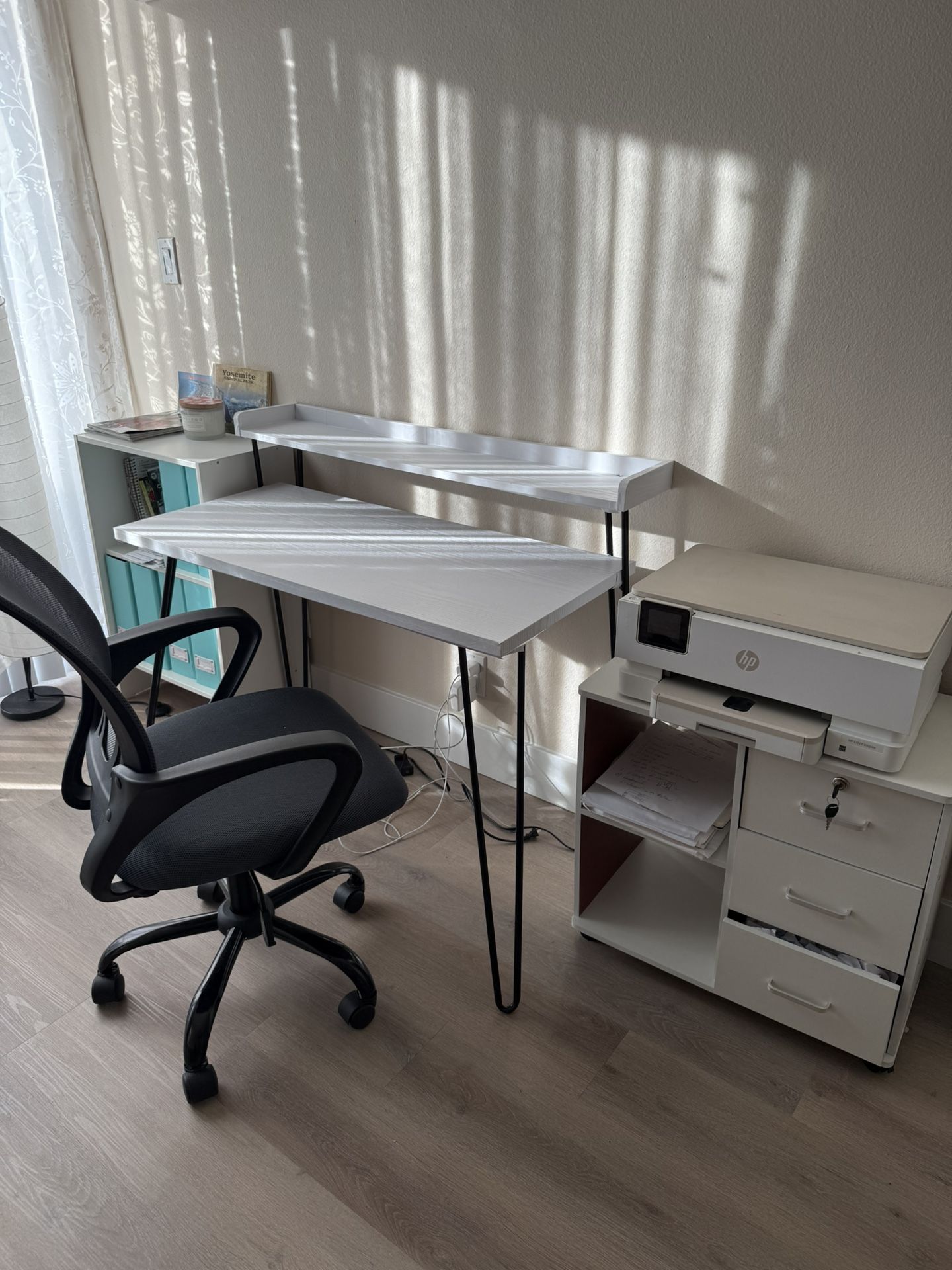 Office table -$15, New chair -$55, 2 stands $40, printer - $40