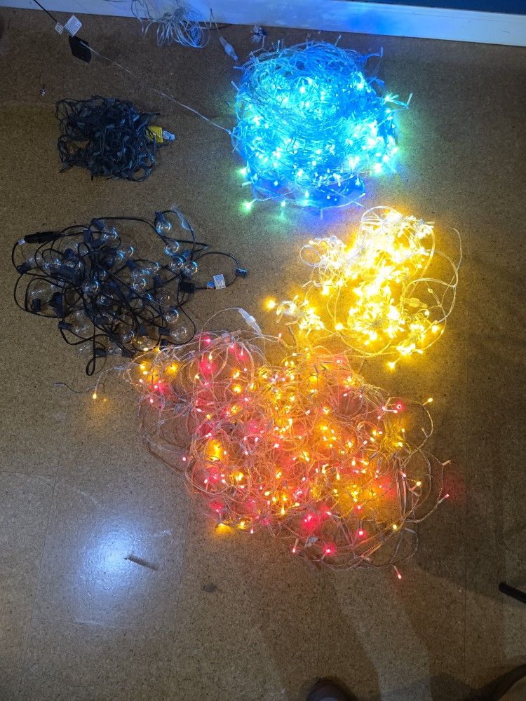 This bundle includes 2 large string lights, one red string lights, one bulb lights, one curtain lights and one colorful icicle lights