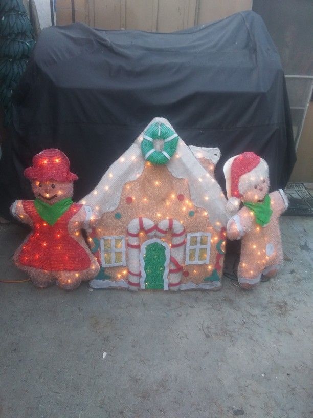 For sale is a Christmas gingerbread house with gingerbread boy and girl. This is a 2d set. 3pc set. The house is 36 tall, the boy and girl are 30 tall each one. All 3 light up. Sold as used as is condition. Will need some work. $15 for all 3