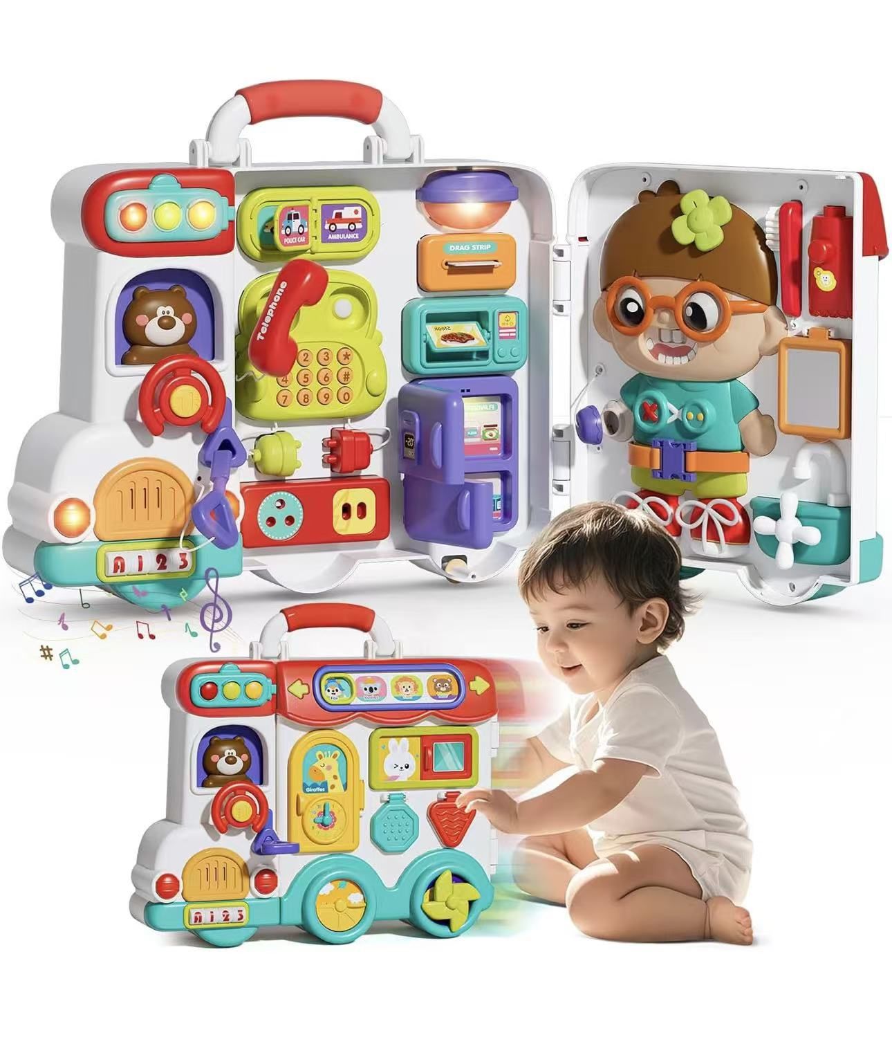 54-in-1 Early Educational Busy Board Montessori Toys For 1 Year Old Girls - Our Montessori toy set includes 54 activity panels offering diverse interactive experiences, including 10 baby songs, 7 colors light, 10 numbers and 9 shapes, Suitable early educational montessori busy board toy for 1 2 year old Girls girls, as they keep babies occupied and entertained for hours while nurturing their creativity and imagination development. Bilingual Learning Toy For 1 Year Old Girls Toddlers - English and Spanish mode, see and say 0-9, 10 baby songs. Great choice for bilingual family or those who want to expose preschool kids to Spanish. In addition, the toy is compact, lightweight, with handles and easy to carry anywhere. For children over 1 years old, this is definitely a great busy toy when riding in a car or plane on a long trip. Toddler Sensory Montessori Toys - The busy board features vibrant colors, various shapes, textures, and sounds, offering sensory stimulation, color match, promoting the development of fine motor skills and hand-eye coordination. It is designed with captivating visuals, offering a visually appealing play experience for toddlers. Suitable learning educational montessori busy board toys for 1 2 year olds boy girl. Ideal Early Educational Busy Board Montessori Toys For 1 2 Year Old Boy Girl Christmas Gifts - This Montessori busy board toy for 1 2 year old boy girl is an ideal gift for kids' birthday, Christmas, Thanksgiving, and other festivals. Suitable busy board toys gifts for 1 2 year old girls 1 2 year old girls birthday Christmas gifts. Safety First - Crafted from premium ABS plastic that adheres to international children's toy standards, this toy is non-toxic and harmless. Our Montessori toys have undergone meticulous polishing, ensuring they are smooth and devoid of sharp corners, thereby preventing any harm to children's hands. Suitable toddler Montessori toys gifts for 1 2 year old girls. Suitable early educational Montessori busy board birthday gift for 1 2 year old boy girl.