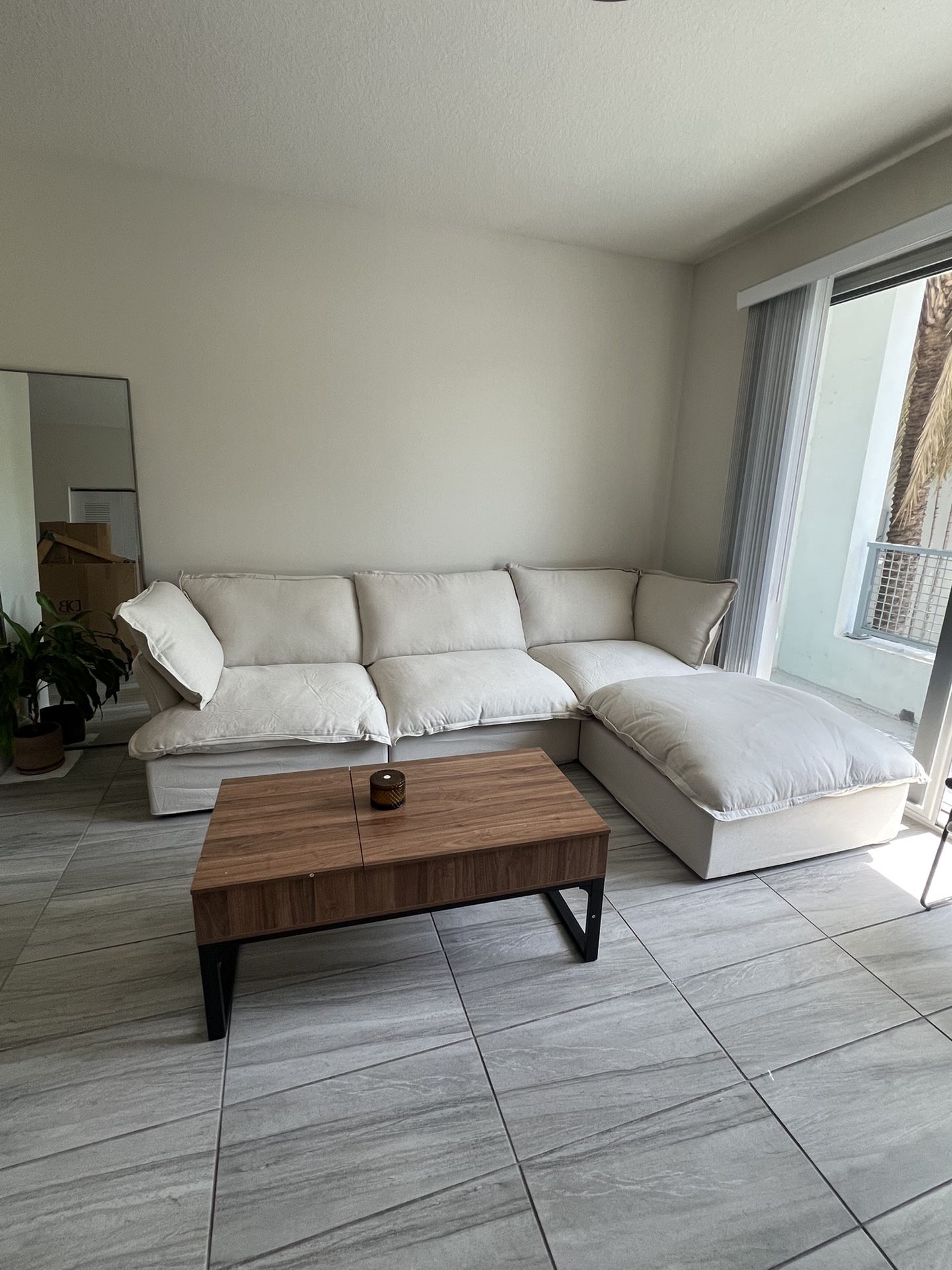 Hi! If anyone is looking for Brand new affordable cloud sectionals message us! Completely Brand new! Lounge in this beautiful & comfortable cloud sectional today. Colors in White, gray & beige Features: -Modular -Removable covers to wash -Built in storage in ottoman -Base covers can be washed We offer delivery & assembly! Dimensions: 120 inch wide 80 inch chaise