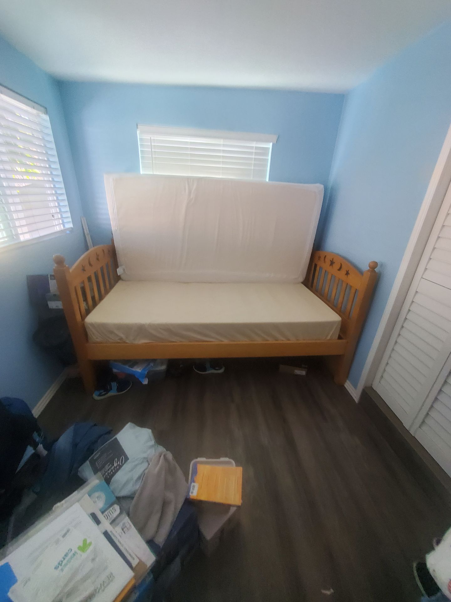 Twin bed with mattress and spring box. Frame is real wood. $180 o.b.o