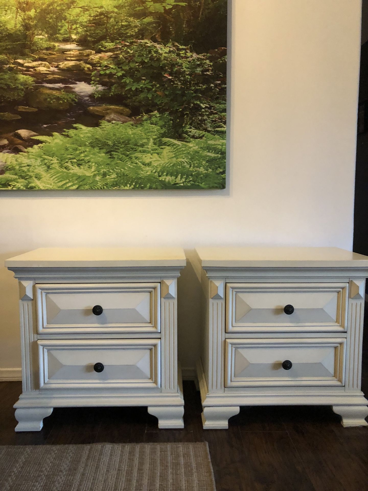 This is an Elements International Calloway 2-drawer nightstand in an antique white finish with dark metal hardware. Mildly stained tops (see in picture). Drawers work well. Lots of storage. $60 for the pair. Local pick up only. No I will not deliver.