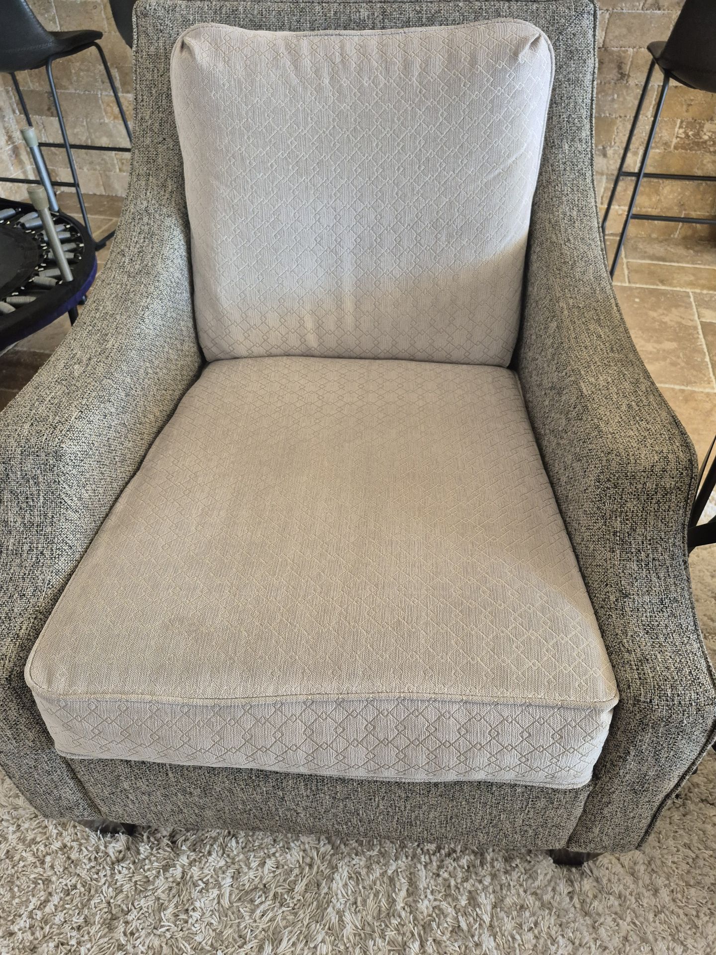 Comfortable, modern accent armchair in neutral gray tones. Clean, versatile design that fits well in living rooms, bedrooms, or reading spaces. Good used condition. Measurements: 27" W, 36" L, 36" H.
