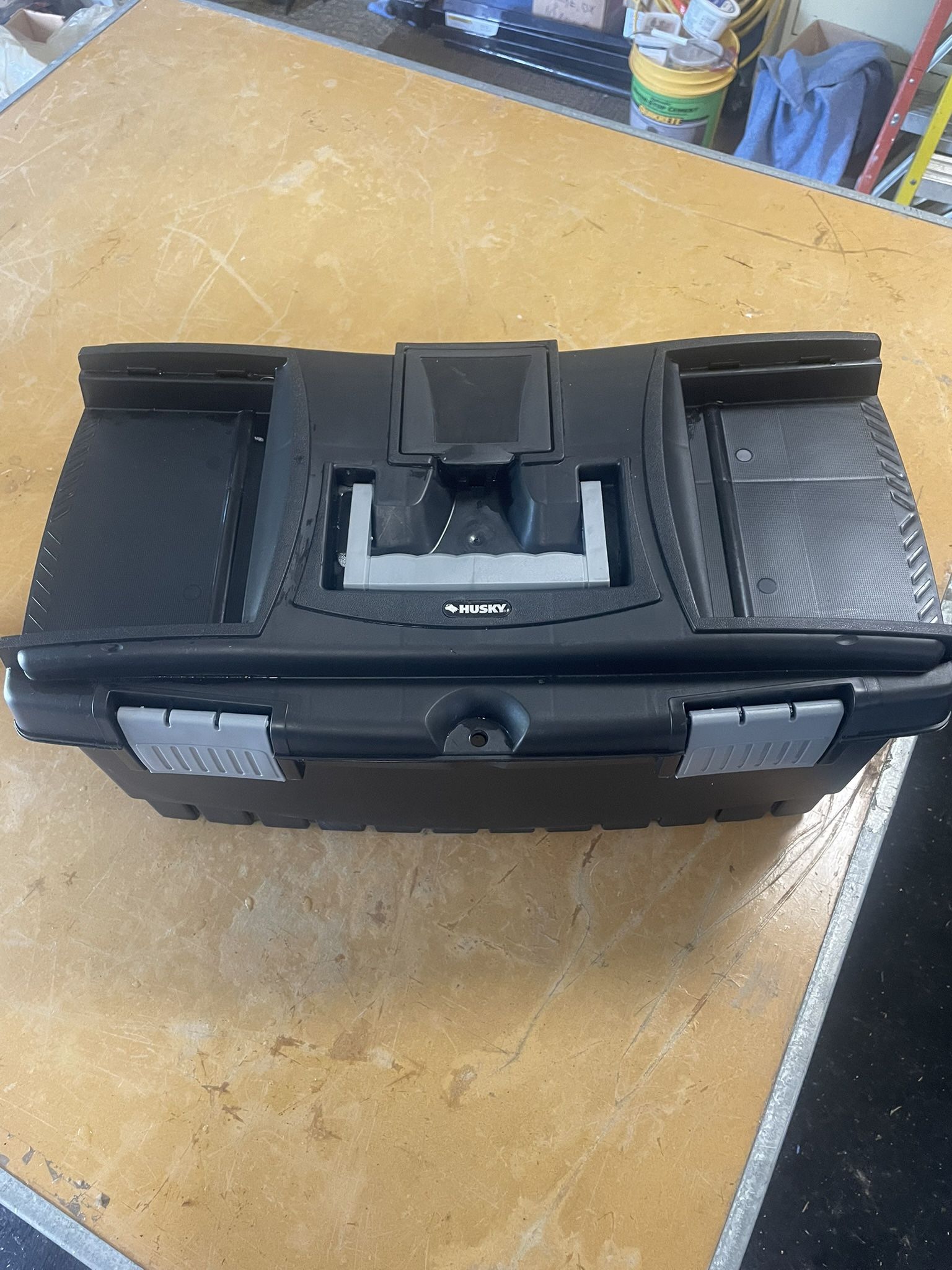 Husky Toolbox 22” Long 12”Wide 11” Tall $5 Has a chipped corner you can see in picture #4 That’s why it’s $5 Still works great