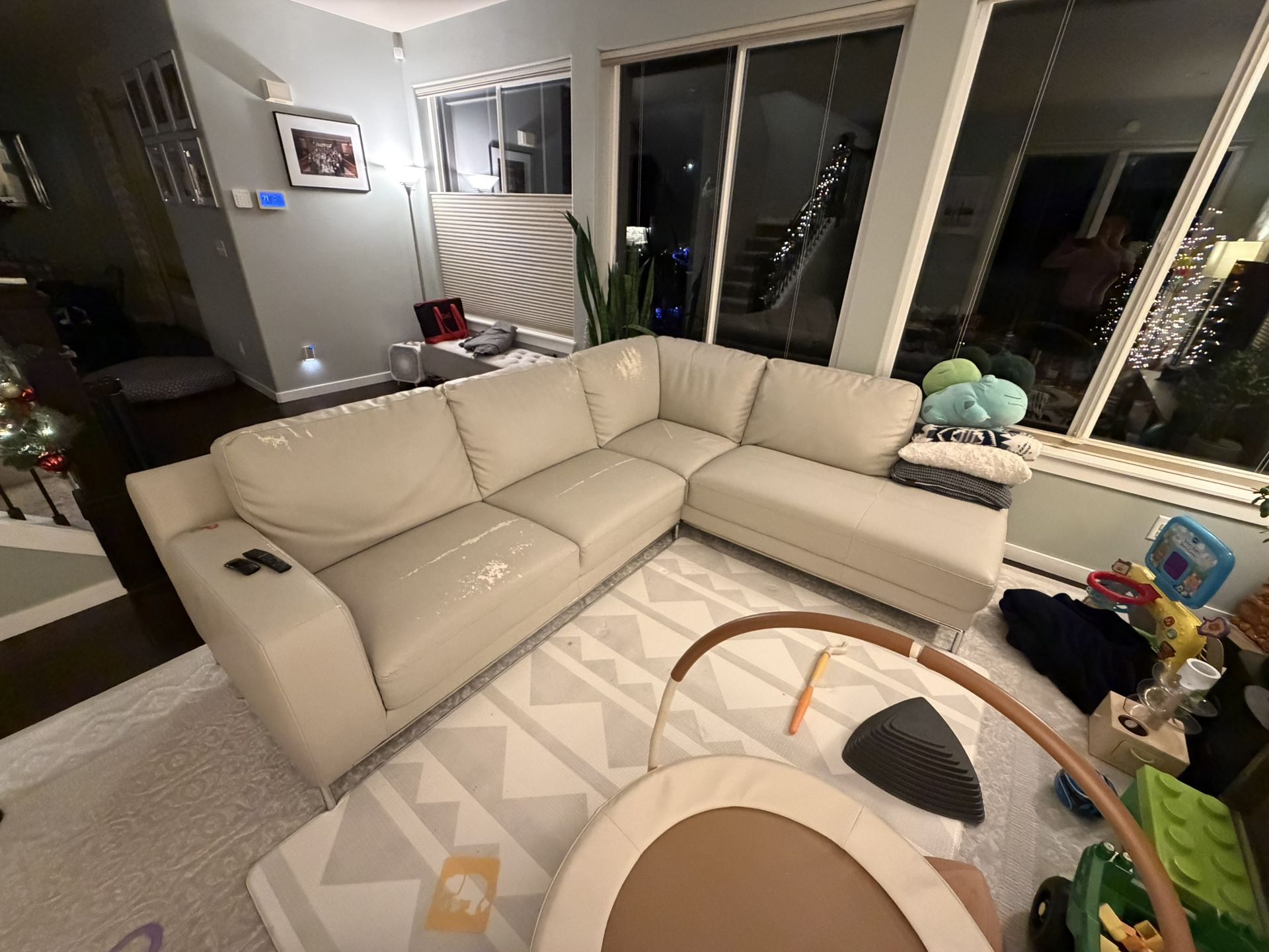 Kasala white leather sectional couch. The leather is peeling off in certain parts of the couch but other than that, the couch is fully functional. Only serious buyer please since I will be moving it down to the first floor of my house the day before you pick up.