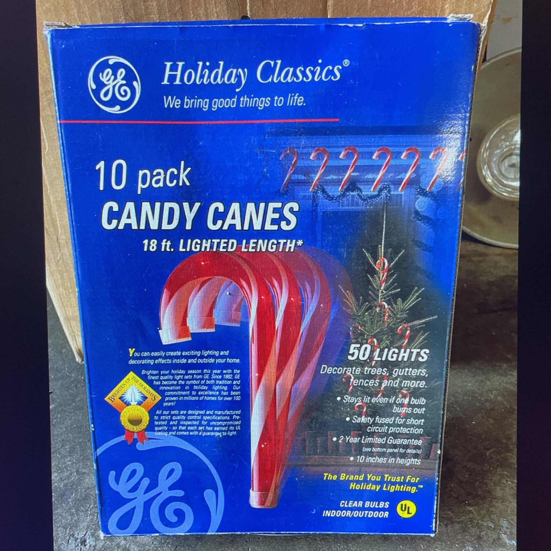 GE Holiday Classics. 10 pack of lighted candy canes, 10 inches high. Into end plugs reaching 18 feet. Indoor/outdoor. Christmas decorations for a yard or walkway. I have 10 boxes of these left.