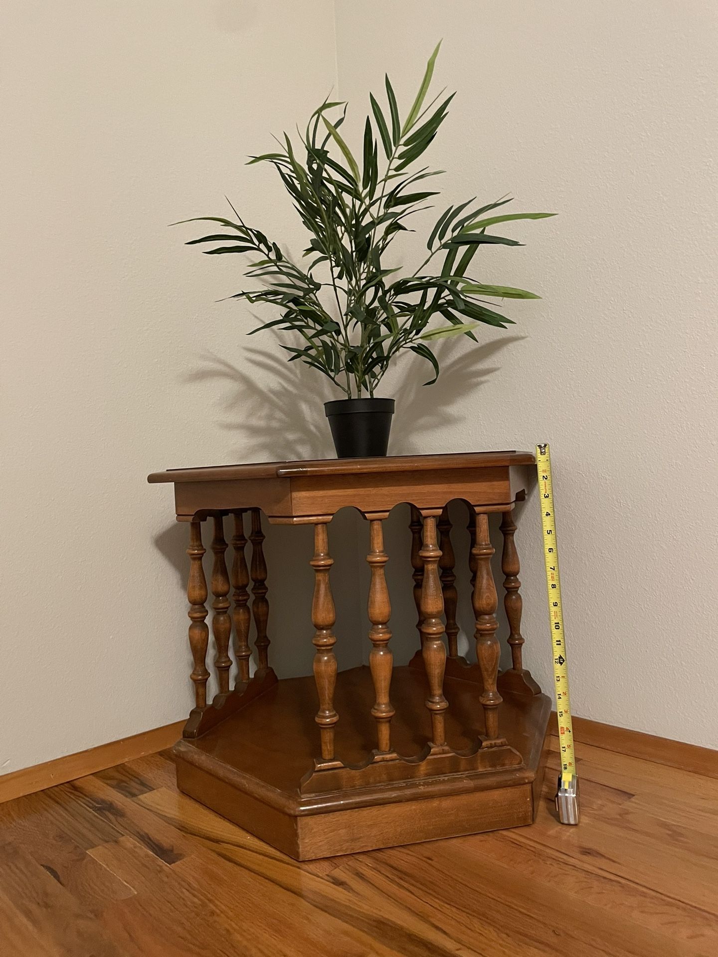unique vintage solid wood midcentury modern (mcm) hexagonal side table end table. good quality, heavy piece. recommend bringing a friend to help move/lift. - faux plant NOT included. CASH only. ty!